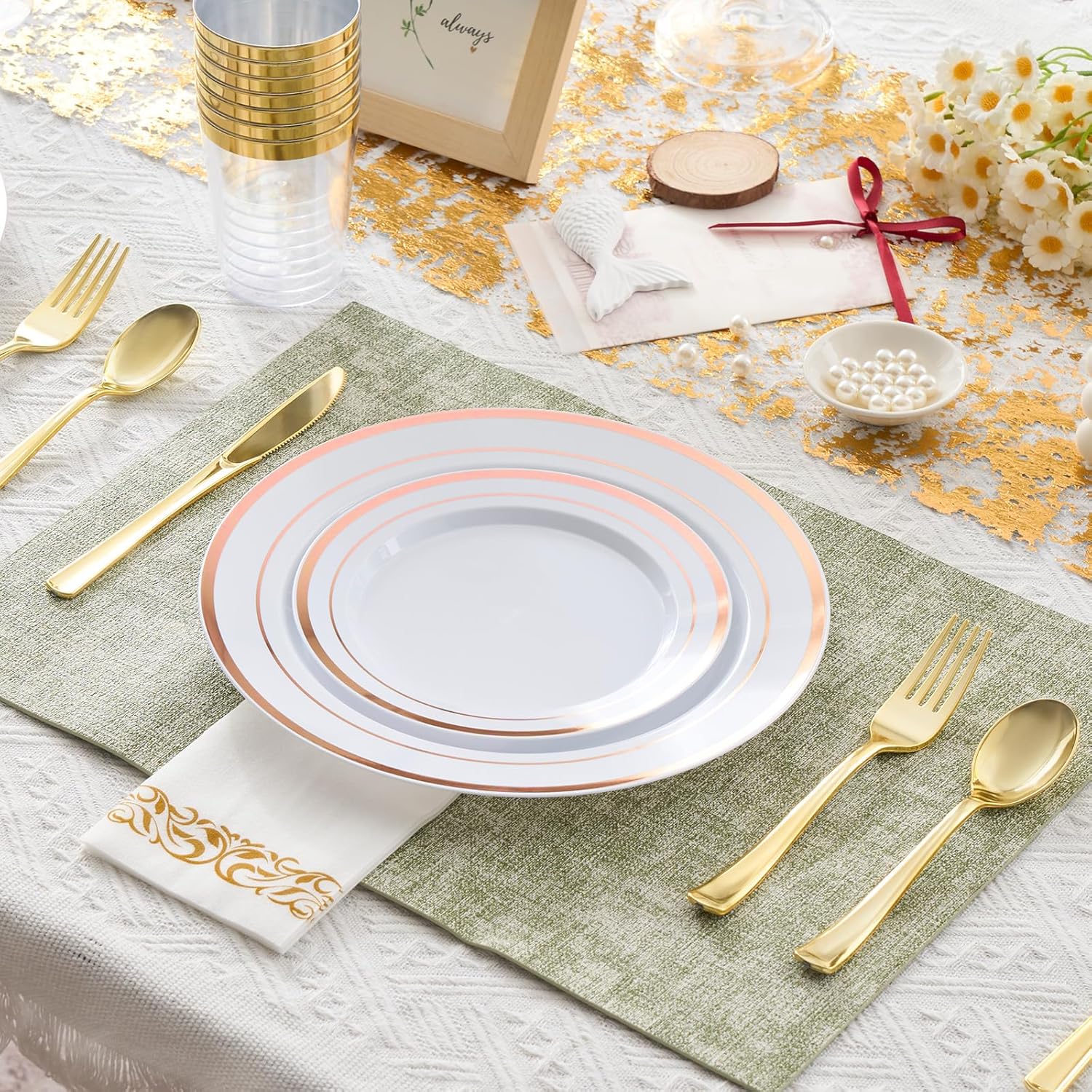 Premium Quality & Safety: Crafted from high-grade, food-grade plastic, our rose gold flatware and plates are 100% BPA-free, non-toxic, and odorless. The material is thick enough to resist cracking or bending under the weight of heavy foods, yet lightweight enough for easy handling. Note: While durable, these plates are designed for single-use convenience and are not microwave or dishwasher safe.