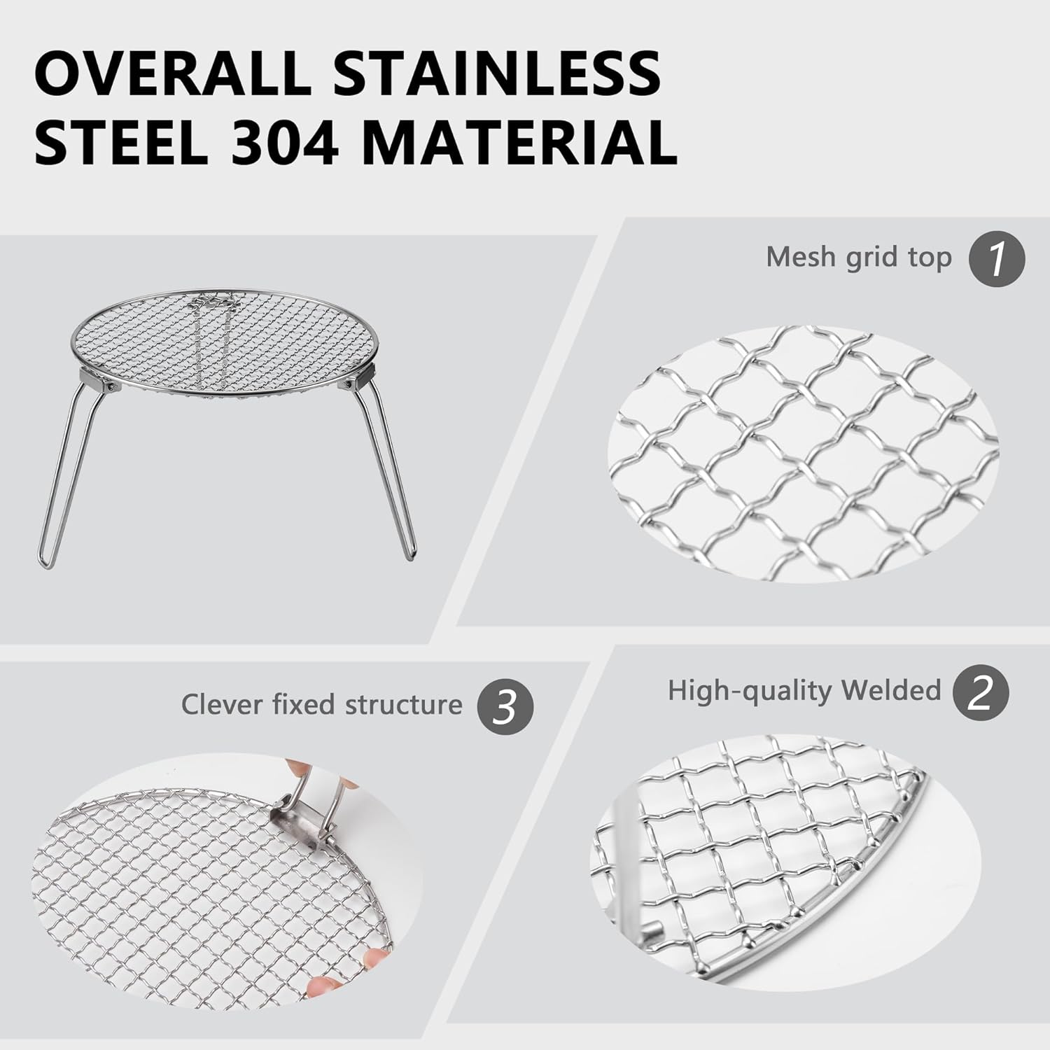 Superior 304 Stainless Steel Construction: Forget about rusty, flimsy gear. Our grill is built from high-grade 304 stainless steel, offering exceptional resistance to corrosion, rust, and high temperatures. With a robust weight capacity of up to 12 pounds, it supports heavy cast iron skillets, pots, and heavy food loads with ease, ensuring years of reliable service.