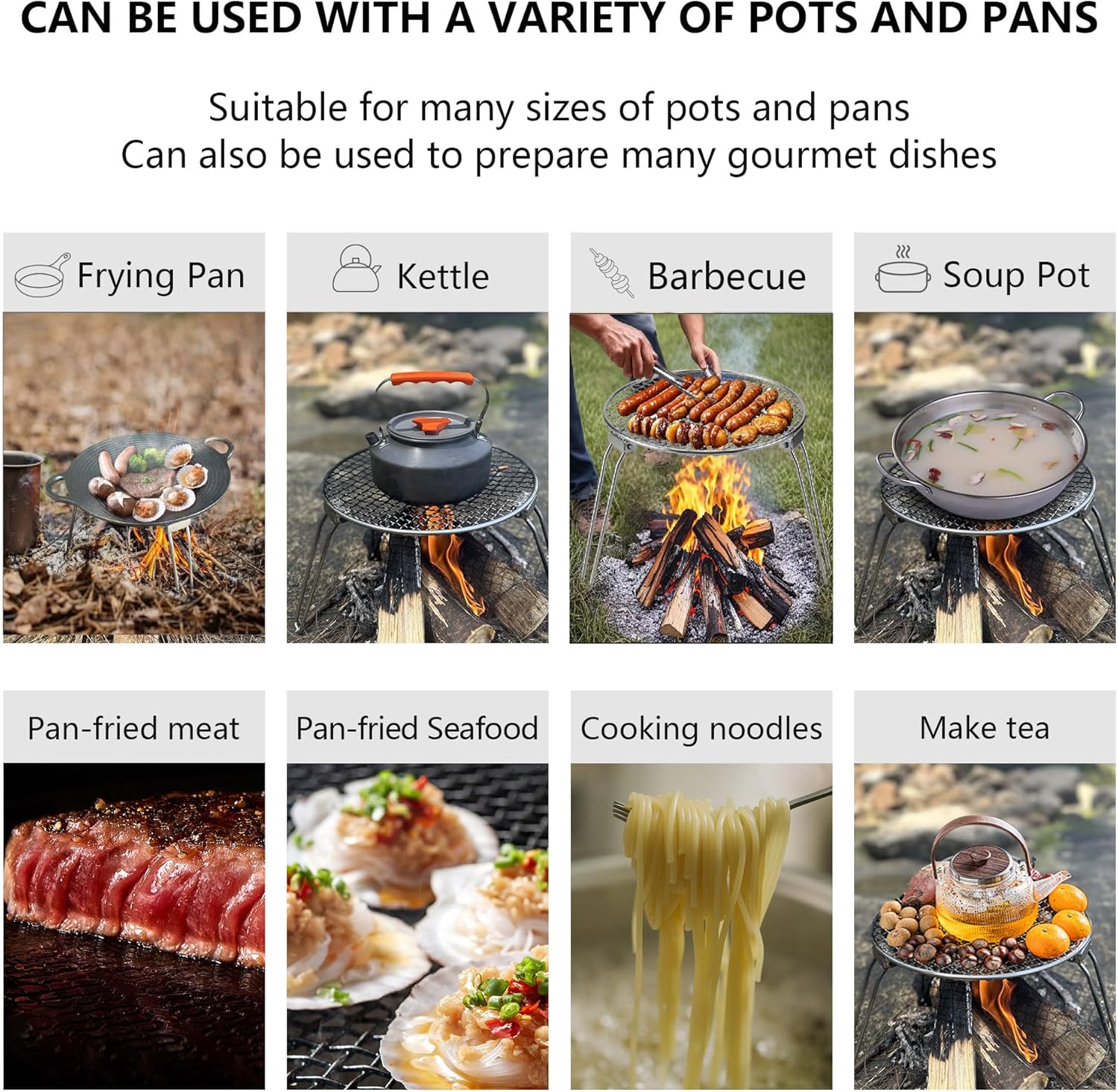 - Instant Setup: Features a tool-free, fold-and-lock mechanism that allows for quick assembly and disassembly in seconds—perfect for rapid setup over campfires or fire pits.