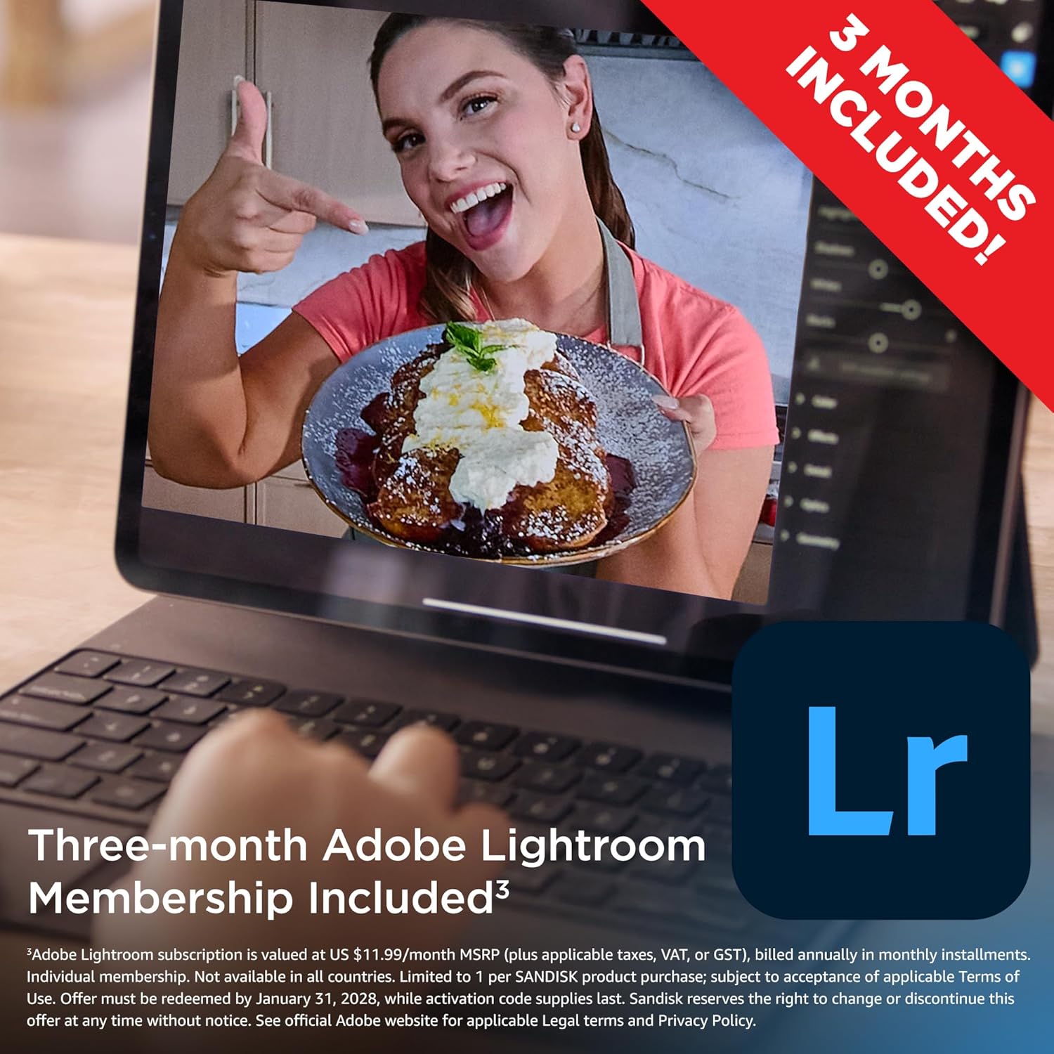(3) Product must be registered and offer claimed by 1/31/26. See sandisk.com/createredemption for details. Requires Adobe account. Terms and conditions apply.