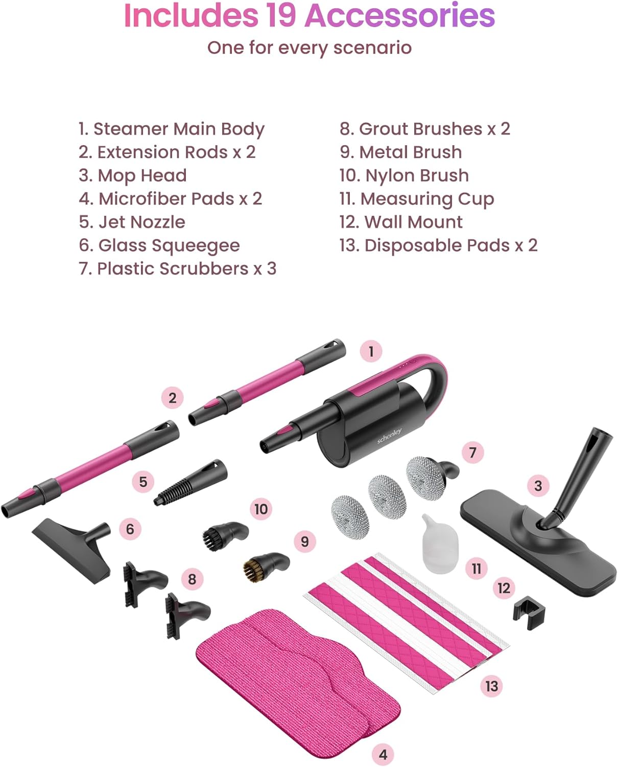 Designed for versatility, the innovative dual-rod structure provides superior stability and control, while the 180-degree swivel steering allows you to navigate around furniture and tight spaces effortlessly. Unlike ordinary mops, the Schenley features a detachable handheld steamer that transforms into a powerful cleaning tool for above-floor surfaces. Equipped with 18 specialized accessories, you can tackle everything from sealed hardwood and tiles to kitchen countertops, stovetops, garments, and even automotive upholstery.