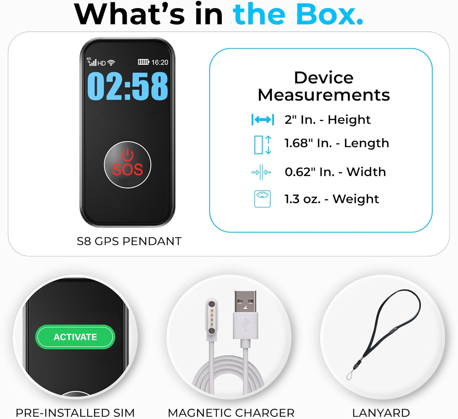 Senior-Friendly & Durable Design: Designed for everyday wear, the pendant features a large, easy-to-press SOS button and a clear display showing time, battery, and signal strength. The IP67 waterproof rating ensures the device is safe in the shower, rain, or against accidental splashes. Plus, with up to 8 days of battery life on a single charge, it minimizes the hassle of frequent charging.