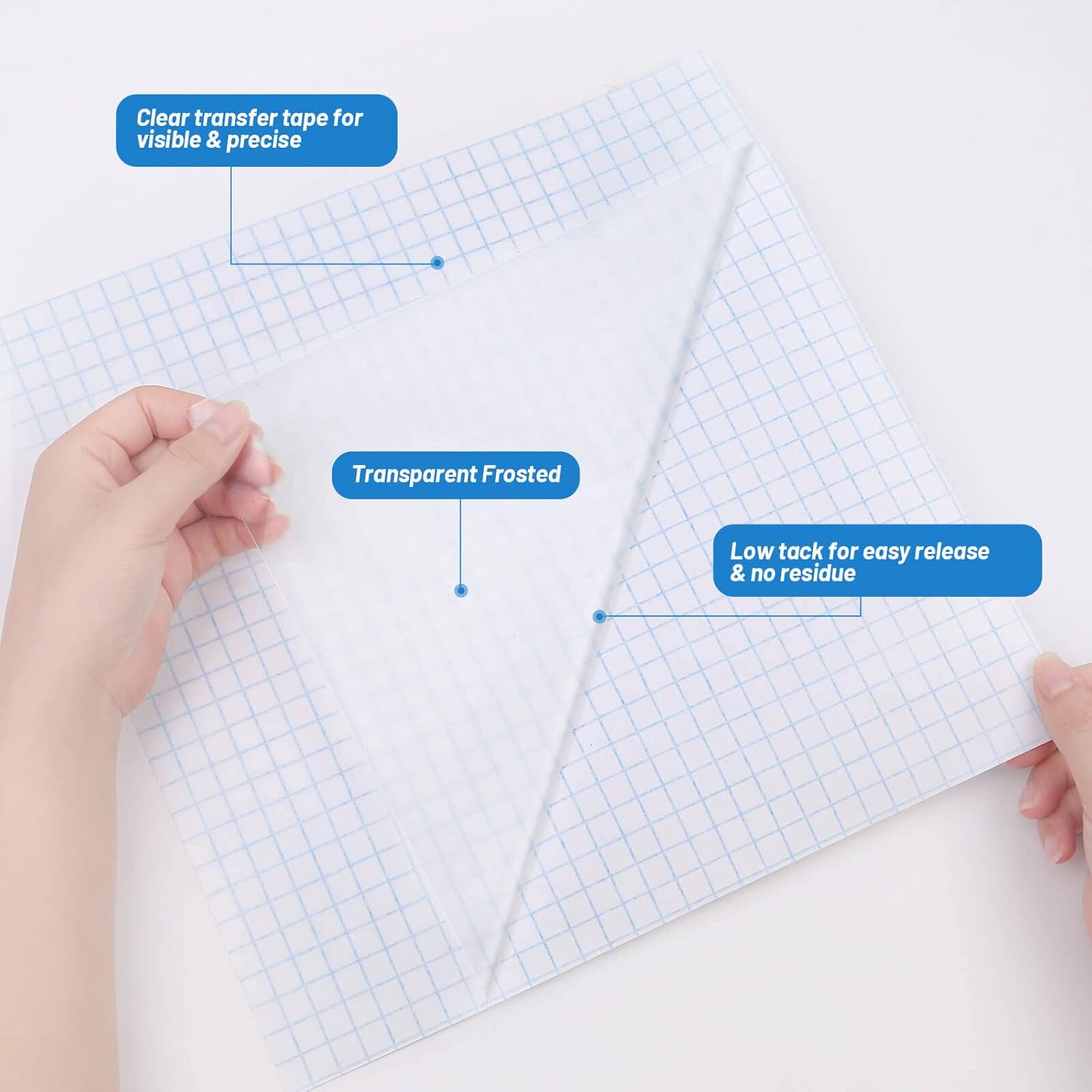 20 sheets of 12×12 inch clear frosted transfer tape. Low-tack adhesive for easy, safe transfers. Perfect for vinyl, decals, scrapbooking, and craft projects. Compatible with Cricut and Silhouette machines.