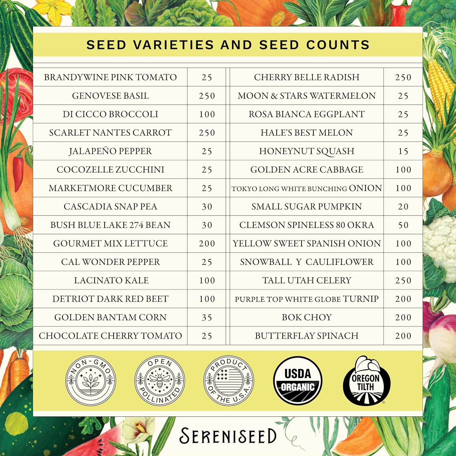 EXTENSIVE VARIETY FOR EVERY SEASON: This 30-pack includes a carefully curated mix of cool and warm-season crops: Genovese Basil, Cascadia Snap Pea, Di Cicco Broccoli, Bush Blue Lake 274 Bean, Jalapeno Pepper, Brandywine Pink Tomato, Gourmet Mix Lettuce, Marketmore Cucumber, Scarlet Nantes Carrot, Cocozelle Zucchini, Cal Wonder Pepper, Lacinato Kale, Detroit Dark Red Beet, Golden Bantam Corn, Chocolate Cherry Tomato, Cherry Belle Radish, Moon and Stars Watermelon, Rosa Bianca Eggplant, Hales Best Melon, Honeynut Squash, Golden Acre Cabbage, Tokyo Long White Bunching Onion, Small Sugar Pumpkin, Clemson Spineless 80 Okra, Yellow Sweet Spanish Onion, Snowball Y Cauliflower, Tall Utah Celery, Purple Top White Globe Turnip, Bok Choy, and Butterflay Spinach.