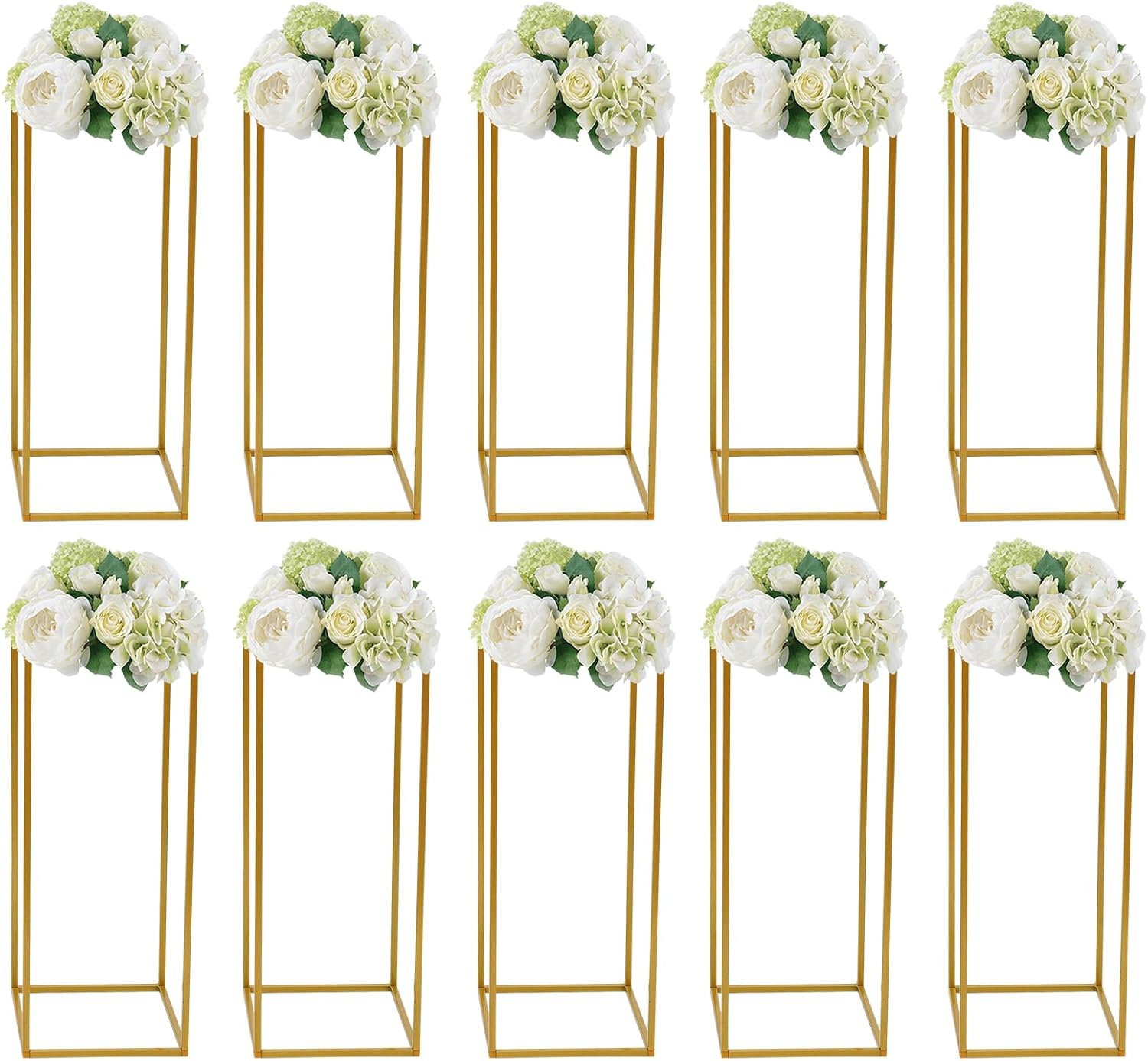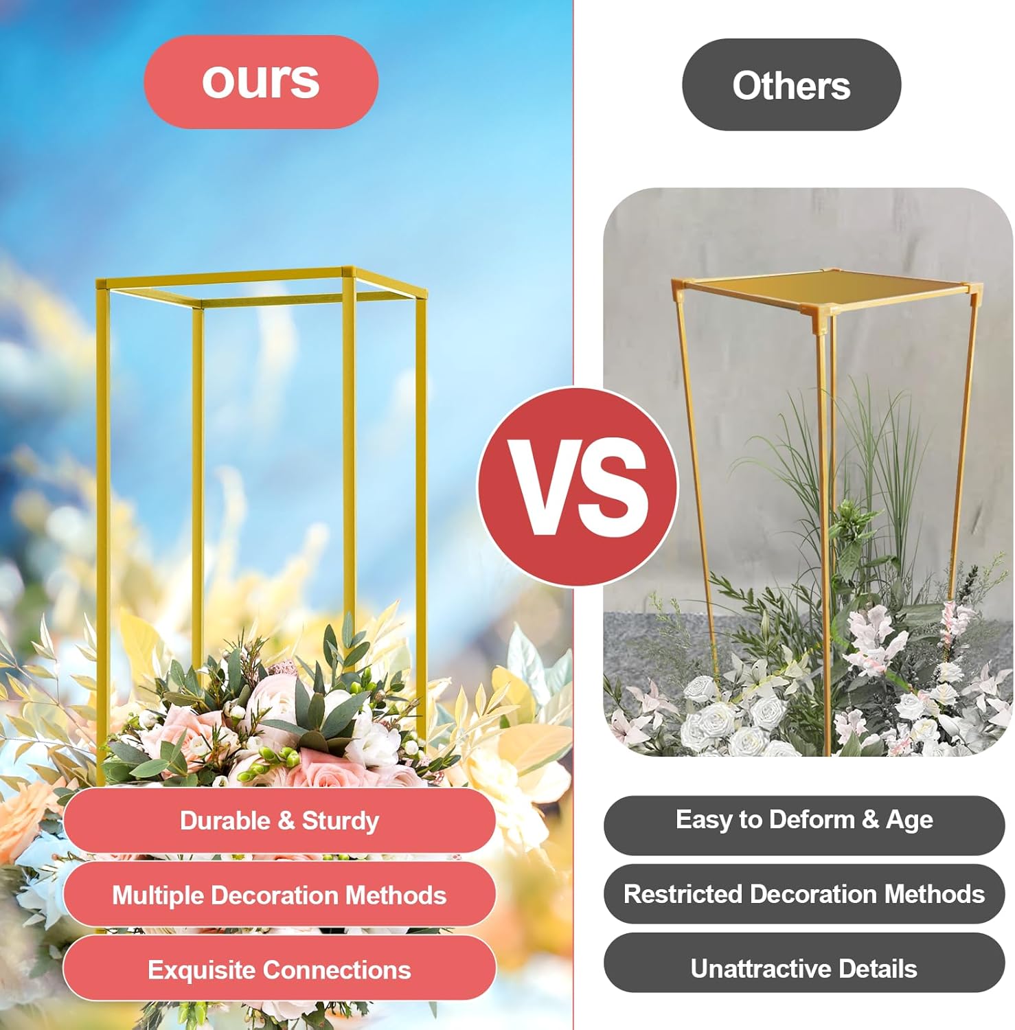 Robust & Stable Design: Engineered with stability in mind, each stand features a reinforced rectangular structure and a wide 9.44″ x 9.44″ base. This solid foundation supports up to 11 lbs of floral arrangements, candles, or decorative accents, ensuring your displays remain secure throughout your event.