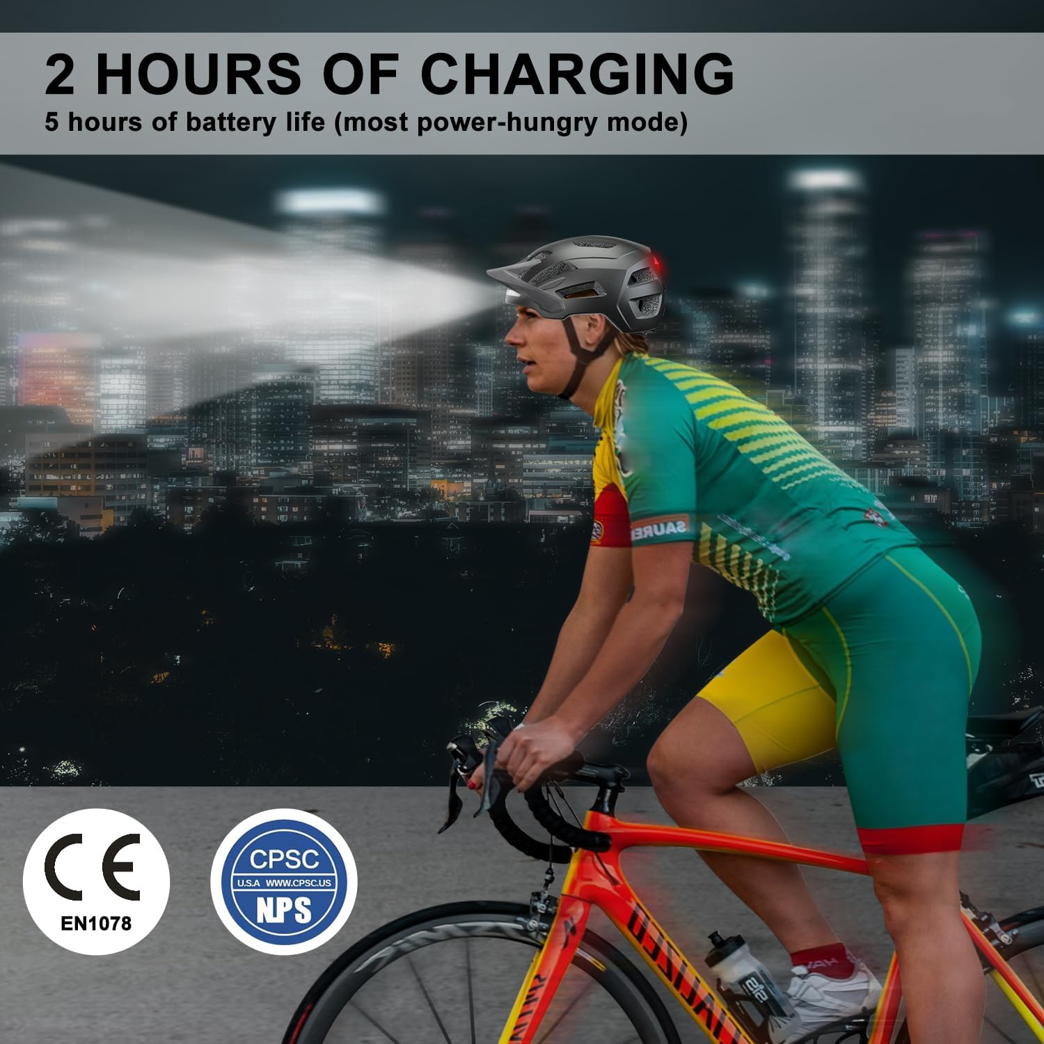 Ride with peace of mind knowing your head is secured. The helmet’s outer shell is crafted from high-density, durable Polycarbonate (PC), while the inner liner utilizes expanded Polystyrene (EPS) foam. This dual-layer structure is designed to absorb and disperse impact energy during a crash. It is fully CPSC and CE certified, meeting rigorous safety standards for bicycle helmets.
