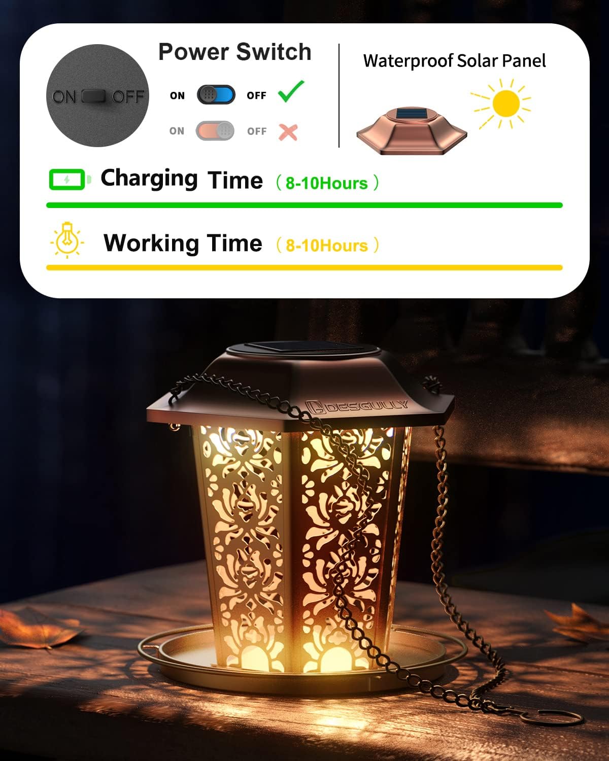 • 2-IN-1 SOLAR DESIGN: Functions as a wild bird feeder by day and a solar-powered lantern by night, featuring a rechargeable battery that provides 8-10 hours of soft ambient light.