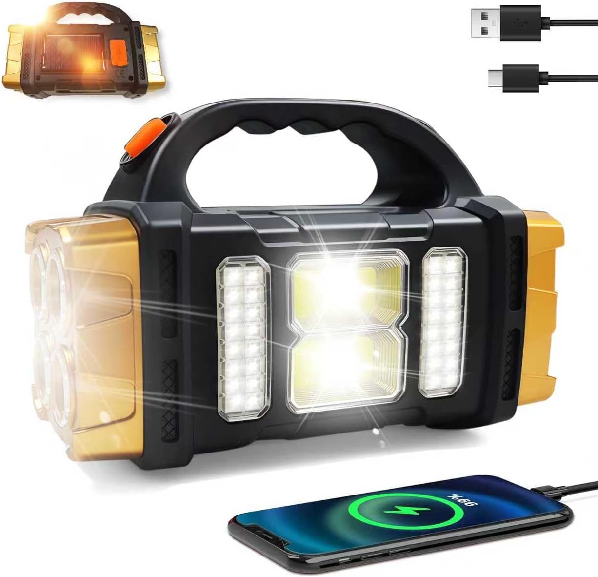 Solar Powered Flashlight with USB Power Bank – Portable LED Camping Light with 4 Modes & Emergency Charger for Outdoor Survival (Gold)