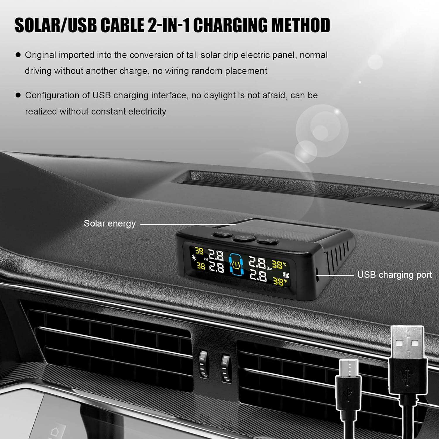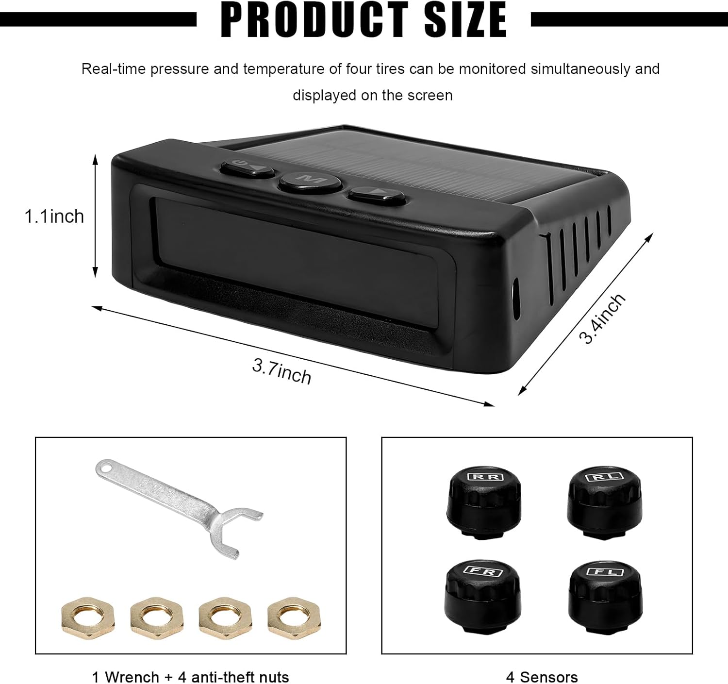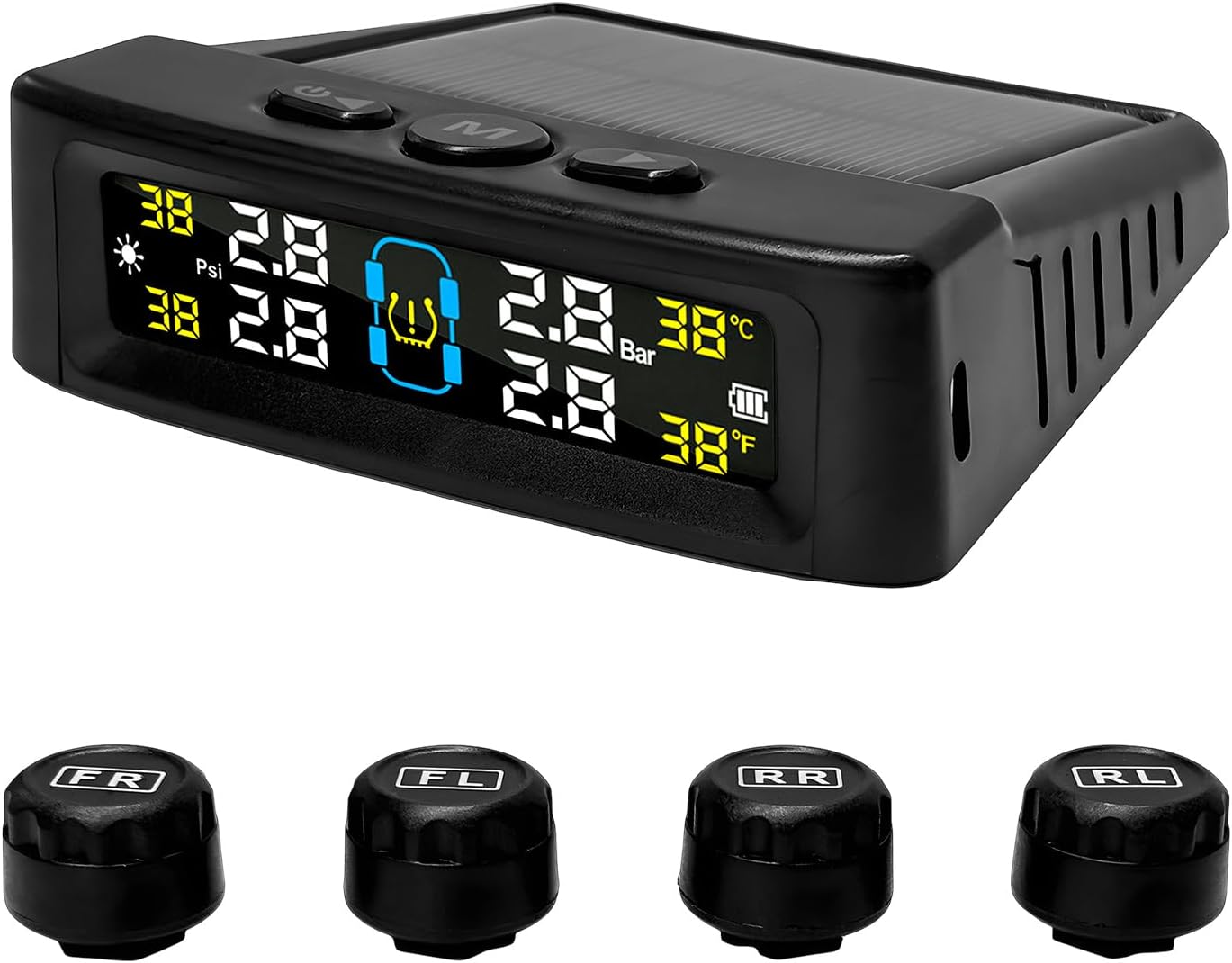 Solar & USB Charging TPMS with 4 External Sensors – Real-Time LCD Tire Pressure Monitor