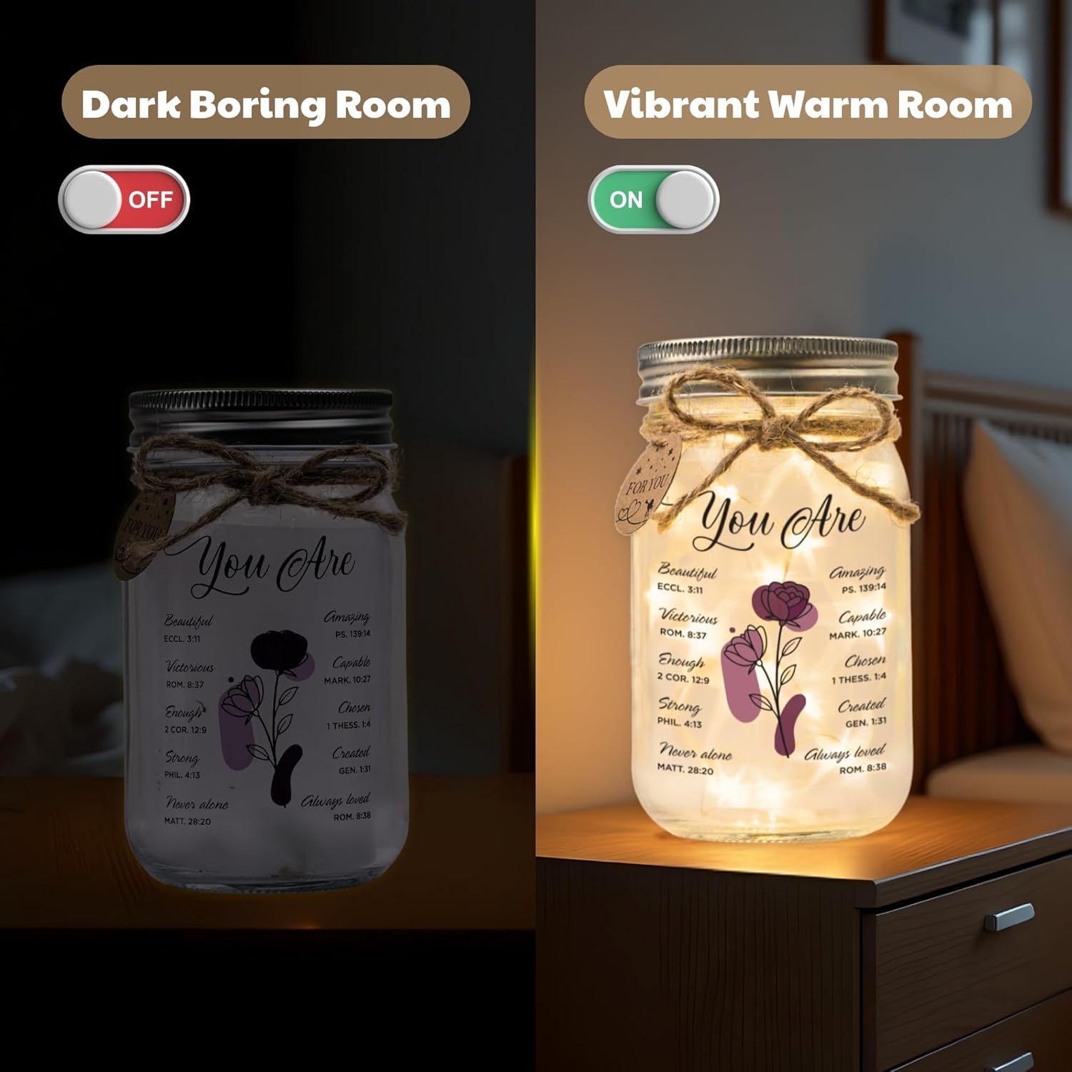 - Rustic Charm: The charming mason jar design complements a variety of home styles, adding a warm, cozy touch to nightstands, bookshelves, or office desks.