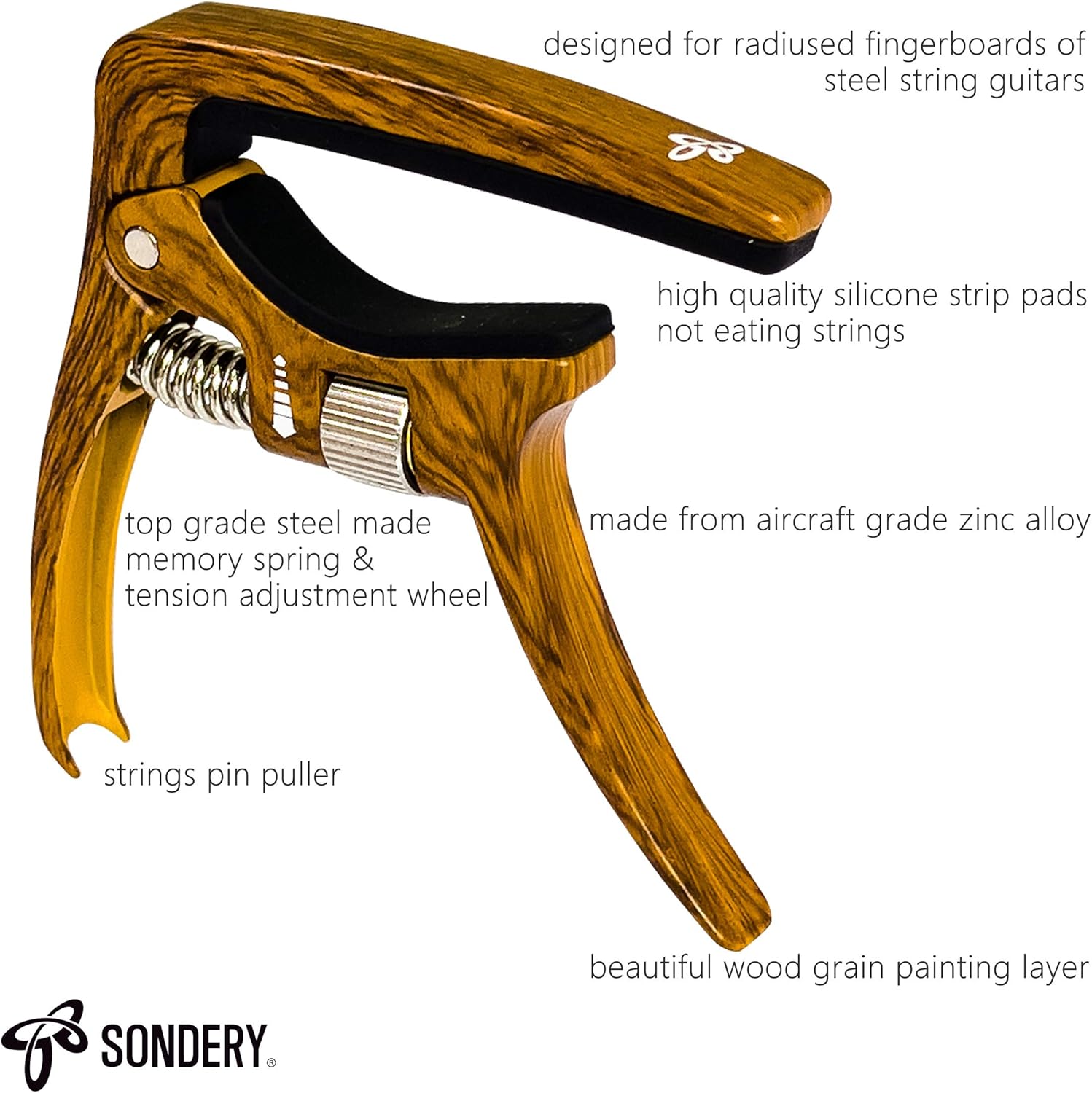 We understand the importance of preserving your instrument. That is why our capo is equipped with high-quality silicone strip pads. These pads are engineered to the perfect hardness to grip the strings firmly without causing damage, wear, or chemical reactions to your finish. As an added bonus, the bottom edge of the capo features a convenient integrated bridge pin puller, making string changes faster and easier than ever. Whether you are a beginner or a seasoned professional, the Sondery Capo is the essential addition to your gig bag.