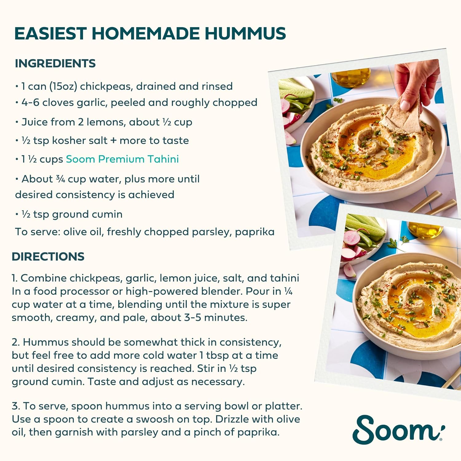 Elevate your culinary creations with Soom Foods Organic Tahini, the secret ingredient used by award-winning chefs worldwide. Crafted from 100% premium roasted sesame seeds, this tahini boasts a deep, nutty flavor and a luxuriously silky texture that blends seamlessly into both savory and sweet dishes. Unlike inferior brands that separate or clump, Soom Tahini is guaranteed to be smooth and easy to mix, making it the perfect foundation for authentic hummus, creamy dressings, and rich desserts. It serves as an excellent nut-free butter alternative, packed with 6g of plant-based protein, calcium, and iron per serving. Whether you are following a Keto, Paleo, Whole30, or Vegan lifestyle, or simply looking for a clean, nutritious pantry staple, Soom provides pure flavor without additives, preservatives, or artificial ingredients.
