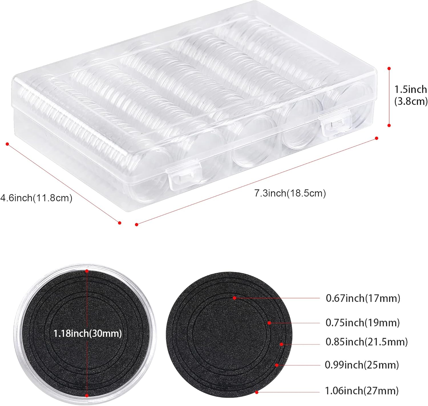 • COMPREHENSIVE 100-PIECE SET: Includes 100 high-quality, clear 30mm coin capsules (Outer: 33mm, Inner: 30mm) and a dedicated plastic storage organizer box to keep your collection tidy and protected.