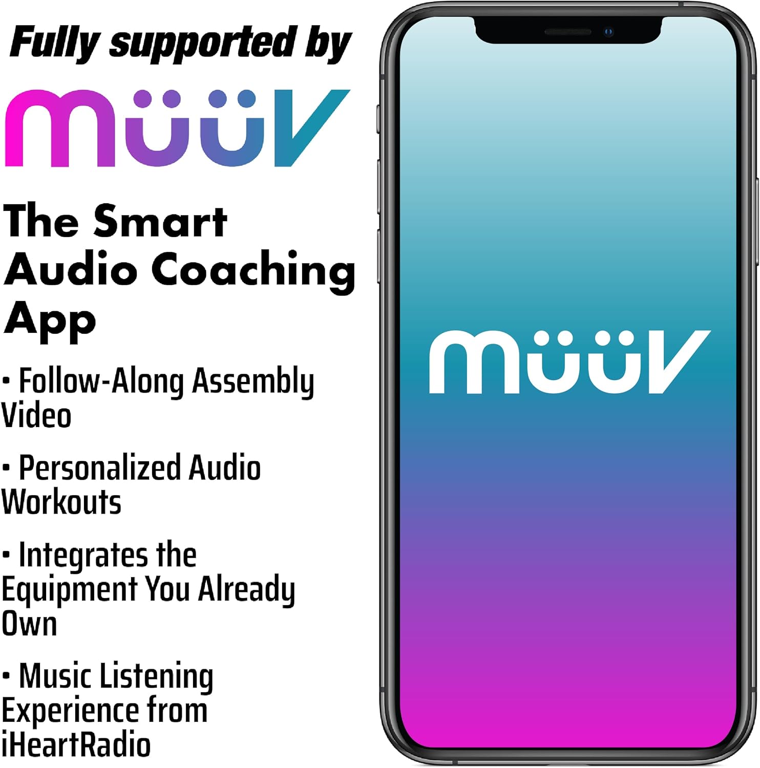 Elevate your training with the included müüv app. This smart audio coaching app guides you through personalized workouts tailored to your equipment, helping you achieve a balanced mix of cardio, strength, and flexibility. Whether you are a beginner or a pro, the müüv app provides ad-free music from iHeartRadio and assembly videos to get you started.