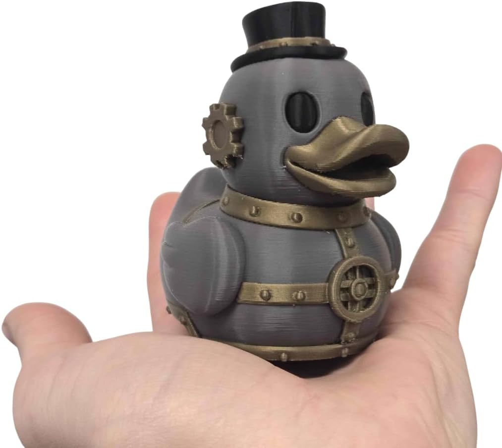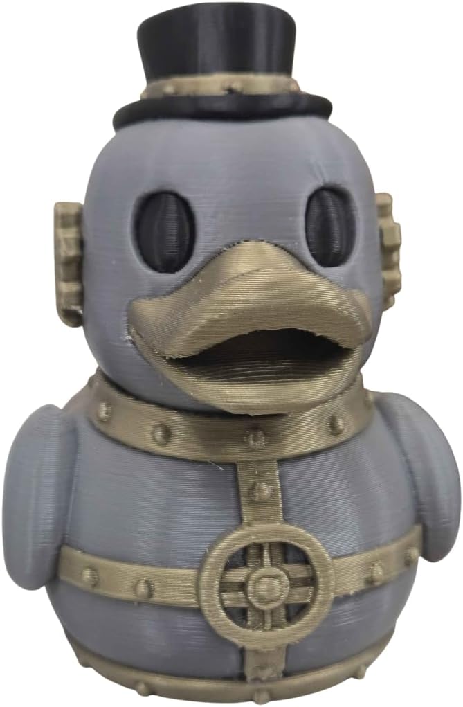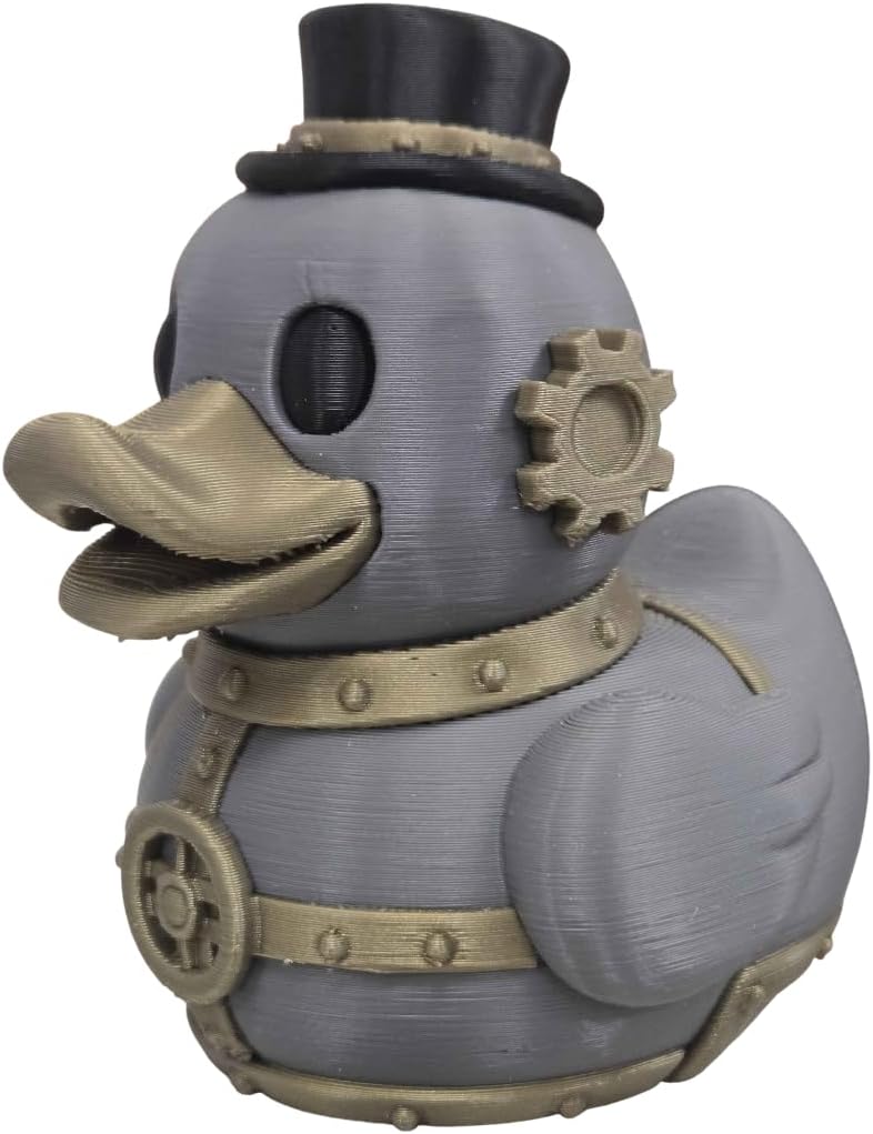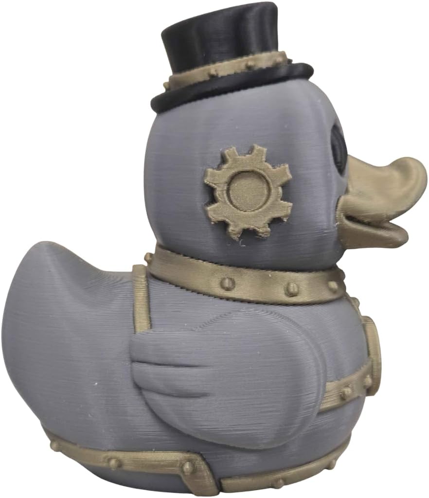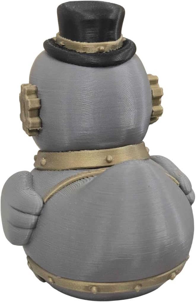 • VICTORIAN GEEK CHIC: A unique fusion of classic rubber duck whimsy and rugged steampunk aesthetics, featuring gears, rivets, and a dapper top hat.