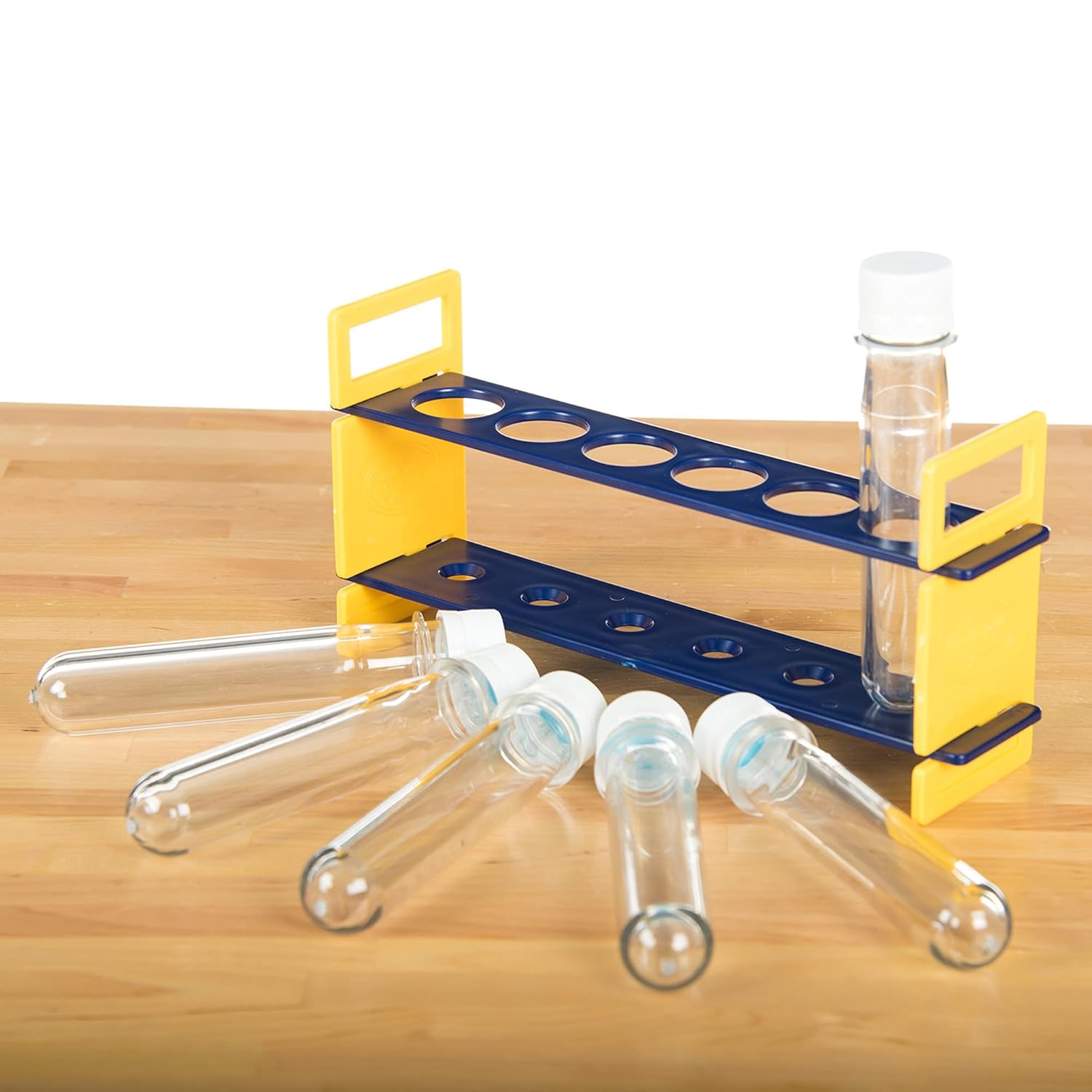 COMPLETE EXPERIMENT KIT: This comprehensive set includes six high-quality, transparent test tubes (1.75 oz / 50ml capacity) and a sturdy, colorful test tube rack. The rack keeps the tubes upright and stable for easy observation and display. Each tube comes with a leak-proof liquid-tight cap, ensuring that your experimental mixtures and specimens are safely stored without spills or messes.