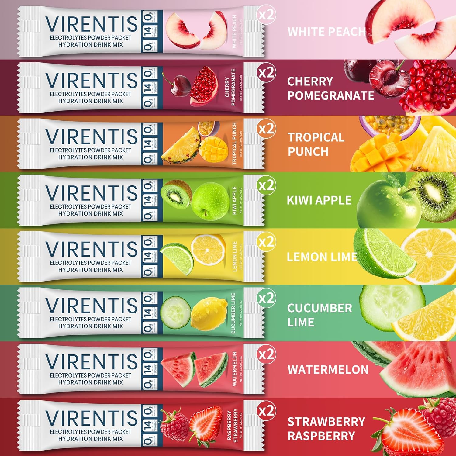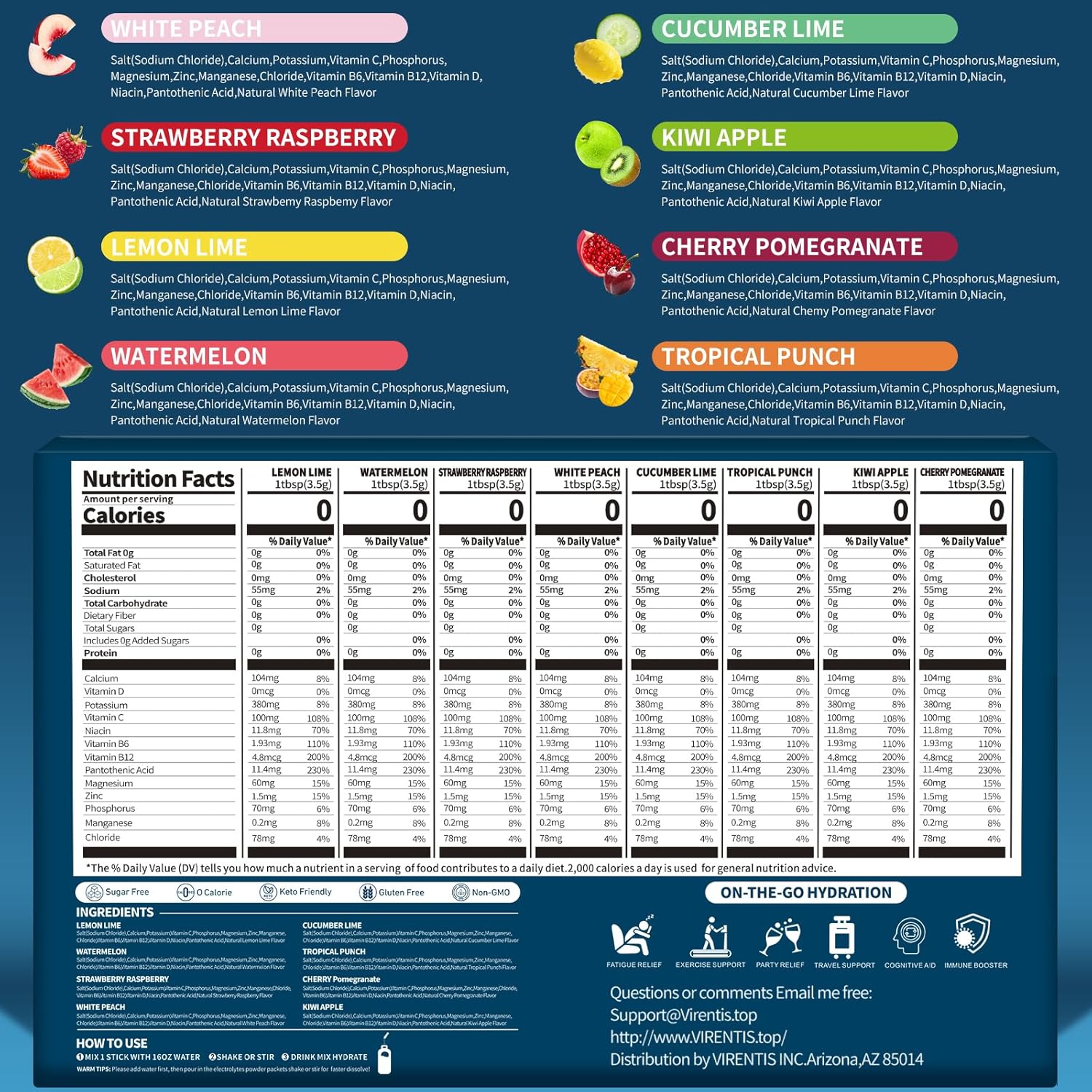 8 REFRESHING FRUIT FLAVORS: Say goodbye to boring hydration. This variety pack includes 16 portable sticks featuring 8 delicious fruit flavors: Lemon Lime, Watermelon, Raspberry Strawberry, White Peach, Cucumber Lime, Kiwi Apple, Cherry Pomegranate, and Tropical Punch. The taste is refreshing and light without being overly sweet or salty.