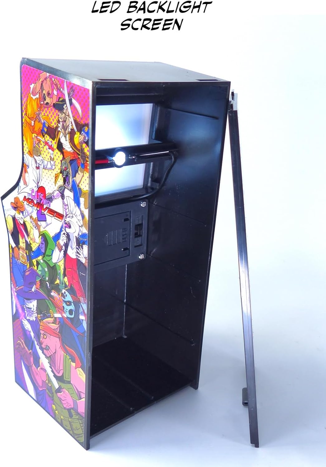 • LIT-UP ARCADE CABINET: Includes a retro arcade machine base with LED backlighting (requires 2x AAA batteries, not included) and 6 swappable film screens, including the exclusive ‘Cats with Knives 2’ theme.