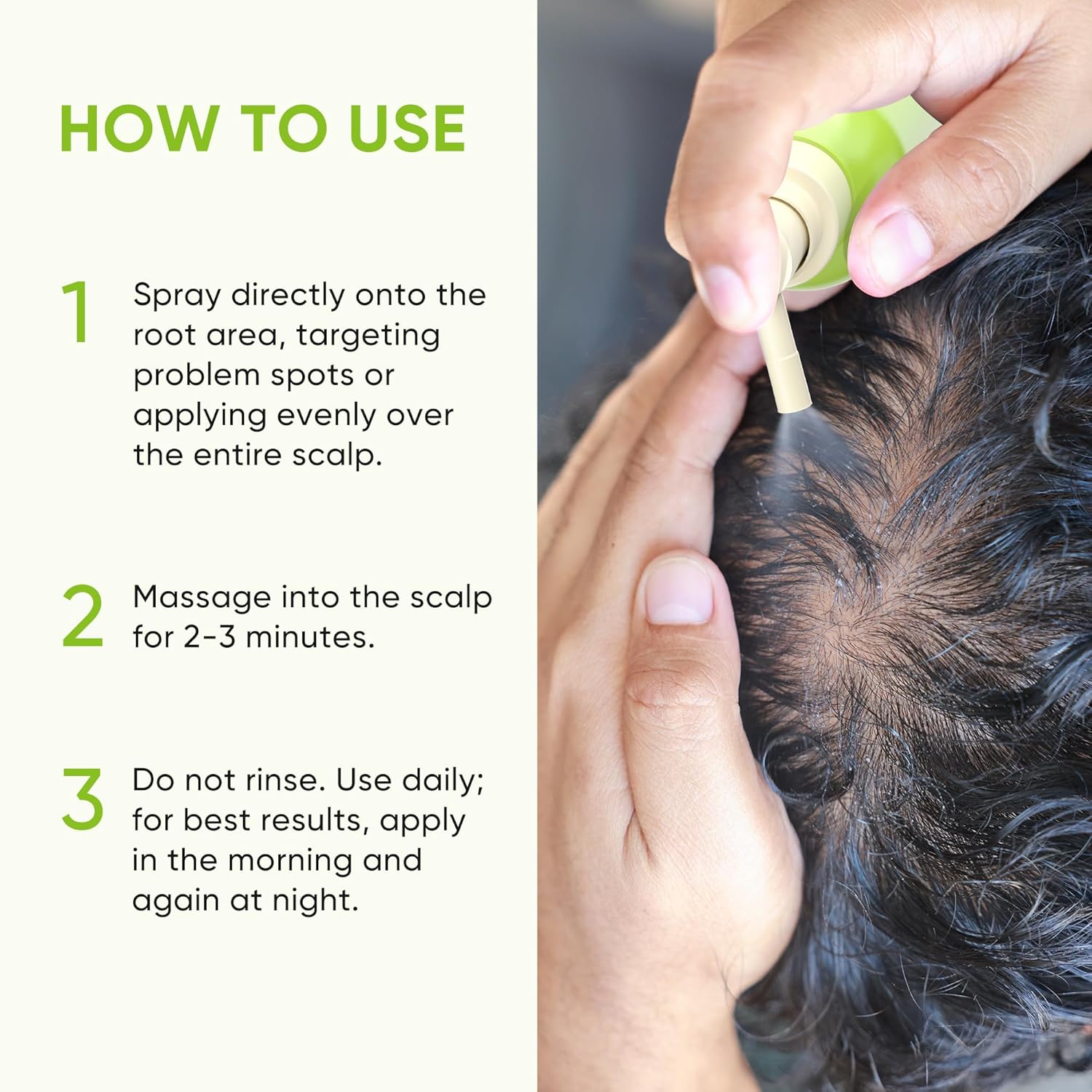 • Easy Application: The precision spray nozzle allows for direct scalp application. Simply massage in—no rinsing required.