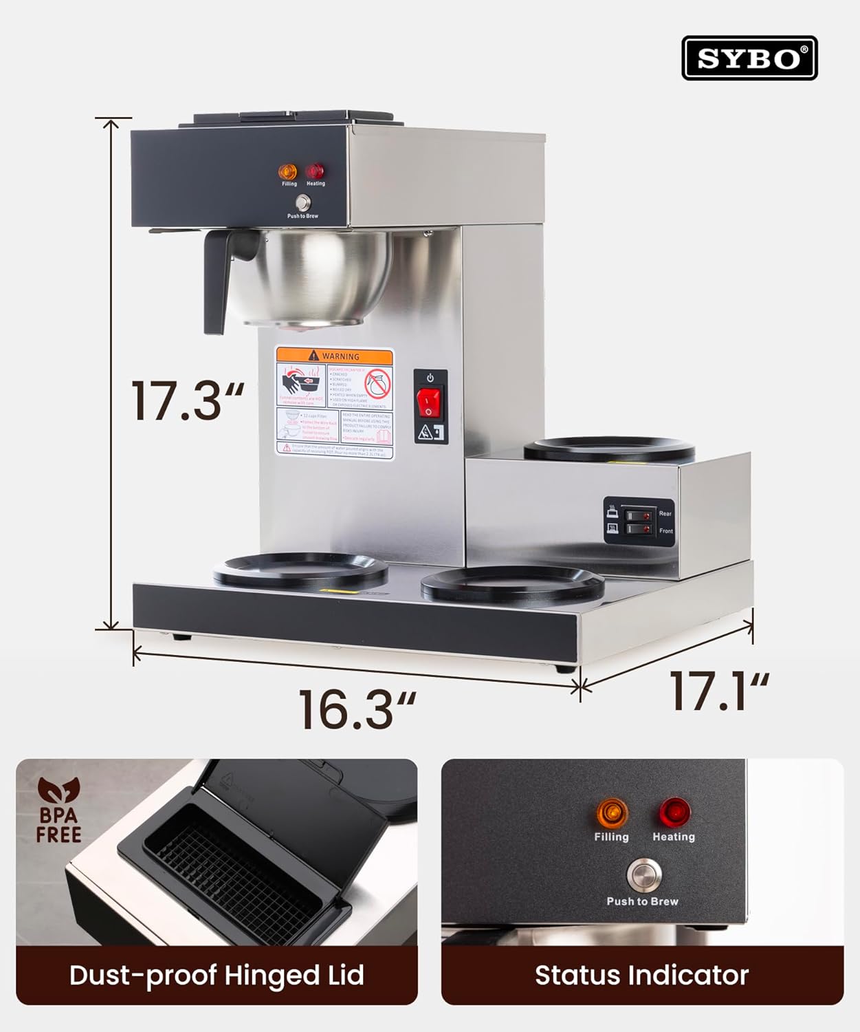 SYBO Commercial Coffee Maker – 12 Cup Pour Over Drip Brewer with 3 Warmers, Stainless Steel