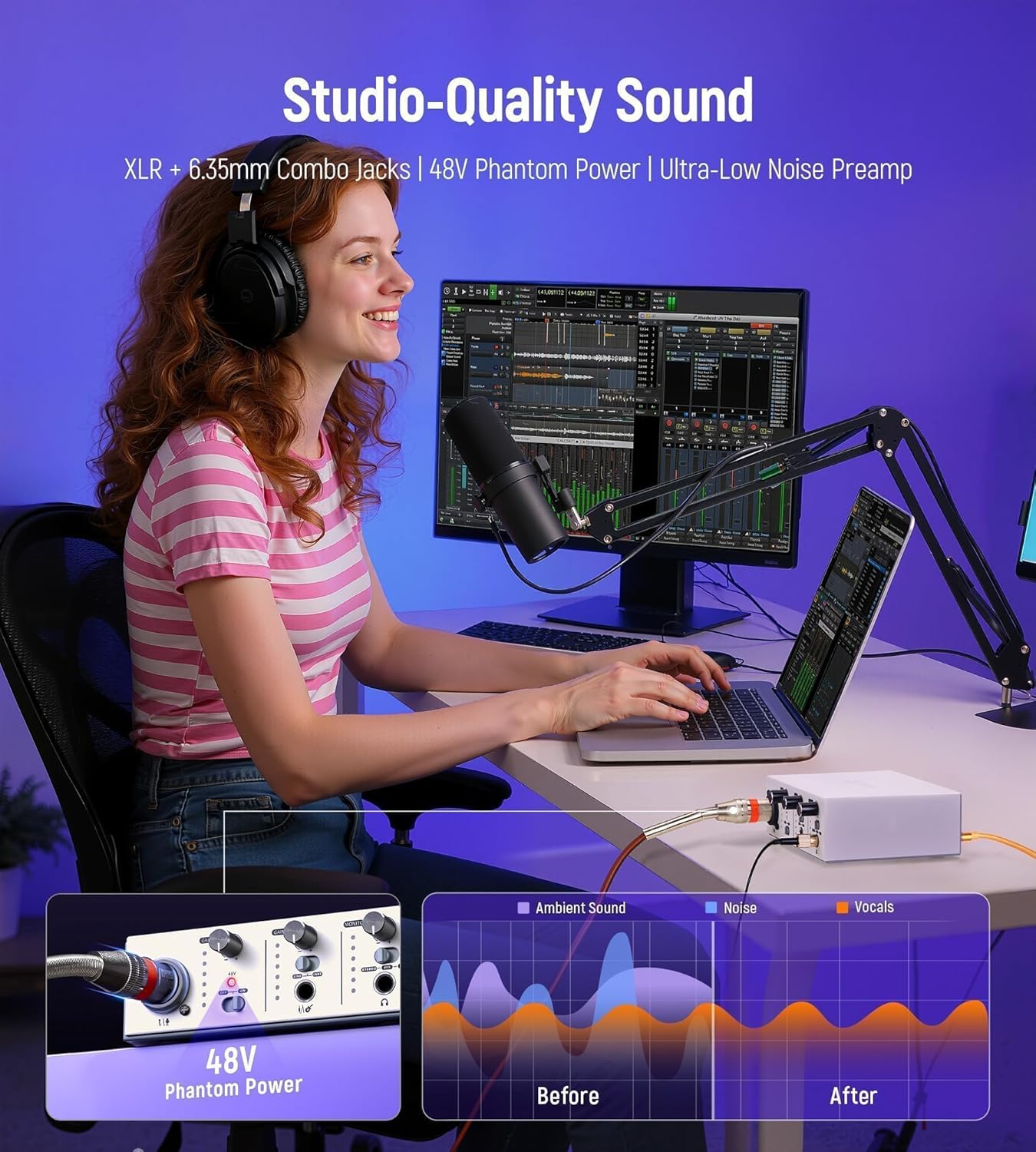 Equipped with a robust XLR combo jack that supports both 6.35mm and XLR microphones, this interface is incredibly versatile. The dedicated 48V Phantom Power switch allows you to use high-quality condenser microphones, capturing every nuance of your performance with excellent noise reduction. The intuitive design includes independent gain controls and a three-color LED indicator (green, orange, red) to help you monitor levels and prevent distortion instantly.