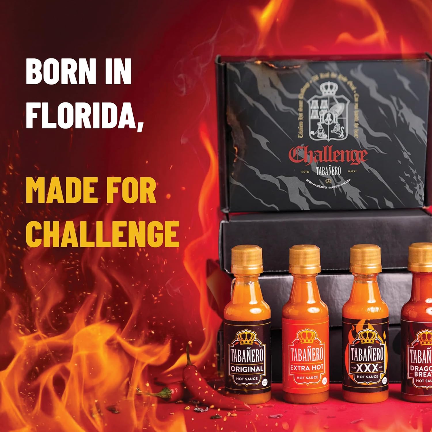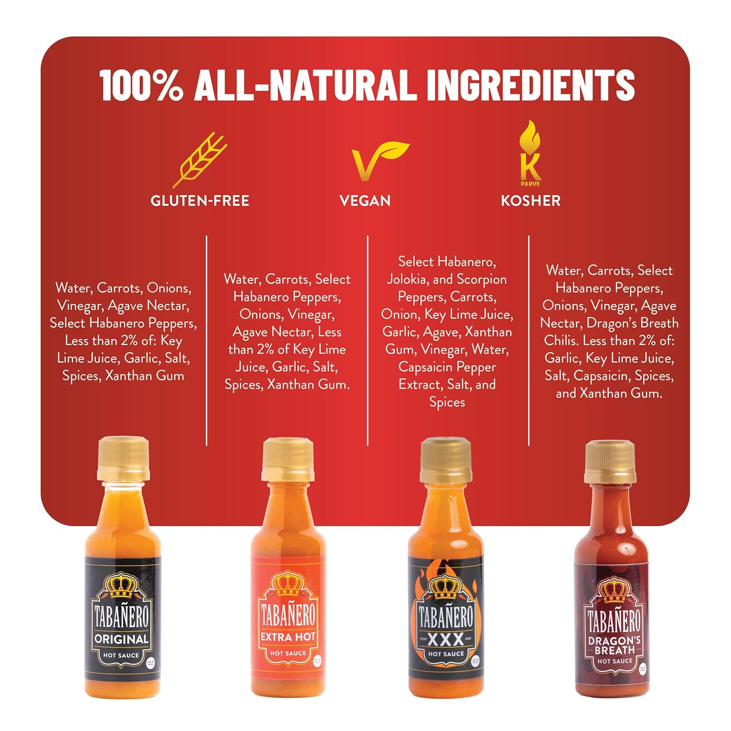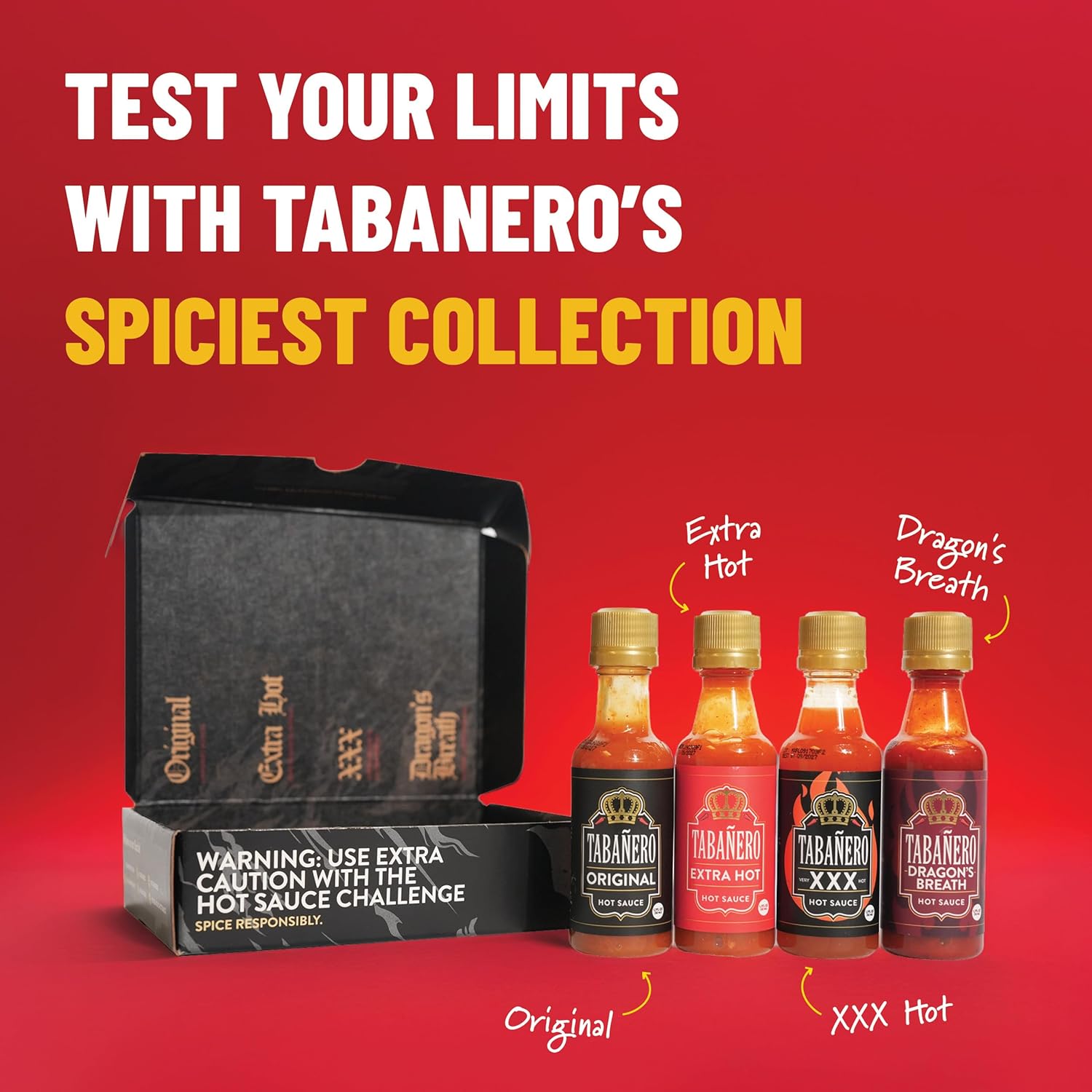 Tabañero Hot Sauce Challenge Box – 4 Pack Spicy Gift Set (Original, Extra, XXX Hot, Dragon’s Breath) – Gluten Free, Vegan, Kosher, Mini Glass Bottles
