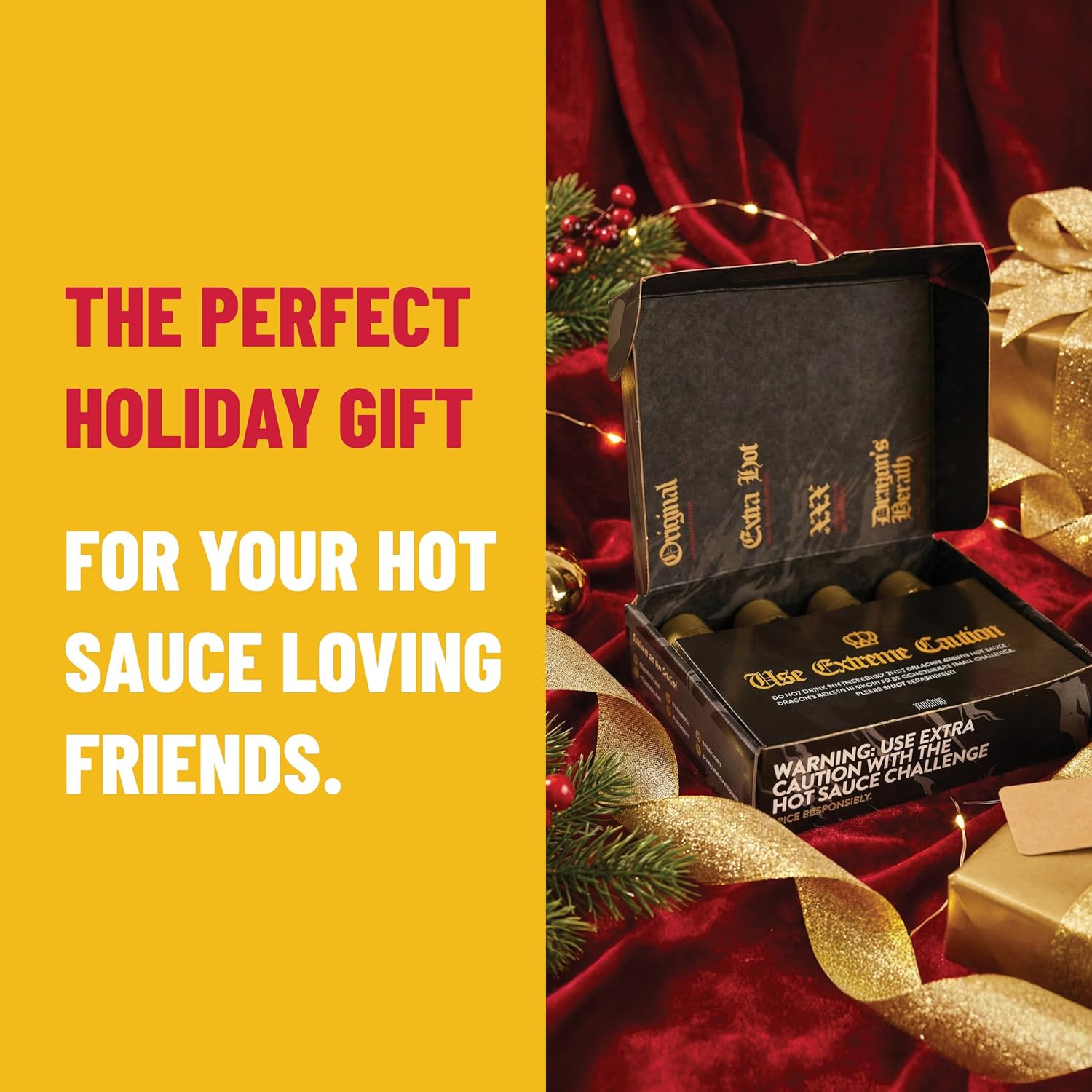 • THE ULTIMATE HEAT CHALLENGE: Take your taste buds on a wild ride with this 4-pack sampler set featuring Original, Extra Hot, XXX Hot, and the infamous Dragon’s Breath sauces.