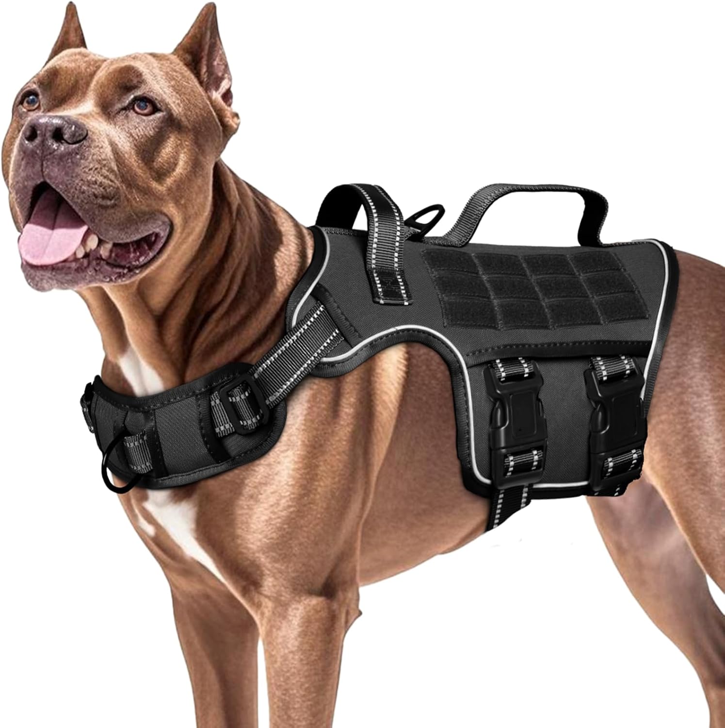 TACTICAL MOLLE SYSTEM & DURABILITY: Designed for versatility, this vest features a robust Molle system on both sides, allowing you to easily attach water bottles, treat pouches, and essential gear. Constructed from high-grade, scratch-resistant materials, the harness withstands tough outdoor conditions. The integrated metal leash rings are welded to withstand extreme pulling forces, making it ideal for powerful large breeds.