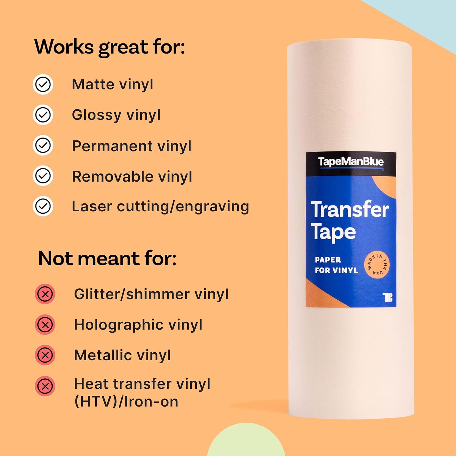 Elevate your vinyl projects with TapeManBlue Premium Transfer Tape – the professional-grade solution for flawless graphic transfers. This 12-inch by 50-foot roll features 4-mil natural colored paper construction, specifically designed for craft die cutters, digital printing, and sign making applications. The medium-high tack adhesive provides optimal stickiness to lift and transfer your vinyl graphics cleanly without slipping or lifting prematurely. Designed with layflat technology, this application tape stays perfectly flat on the silicone release liner, ensuring smooth transportation and hassle-free installation. No more peeling edges or tape that won’t stay in place – our advanced adhesive keeps everything secure while allowing precise positioning. When it’s time to apply your design, enjoy bubble-free, tear-free removal that leaves zero sticky residue behind, preserving the pristine quality of your decals and graphics. Proudly made in the USA with 100% American materials, this transfer tape delivers consistent, reliable performance for both professionals and beginners. Whether you’re creating custom decals, applying vinyl letters, or working on intricate die-cut designs, this 12-inch transfer tape roll makes the process simple and frustration-free.