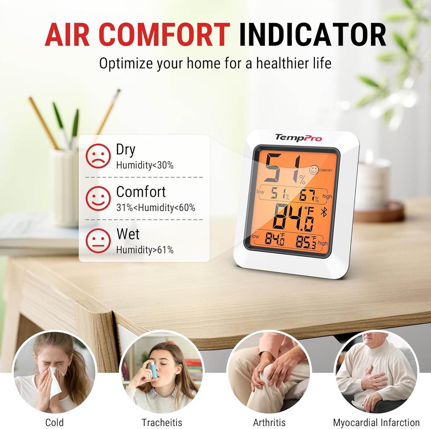 Take control of your home’s climate with the TempPro Bluetooth Hygrometer Thermometer. Designed for precision and convenience, this smart monitor allows you to track temperature and humidity levels remotely via the ThermoPro Sensor app, ensuring your living space, nursery, or greenhouse remains within optimal conditions.