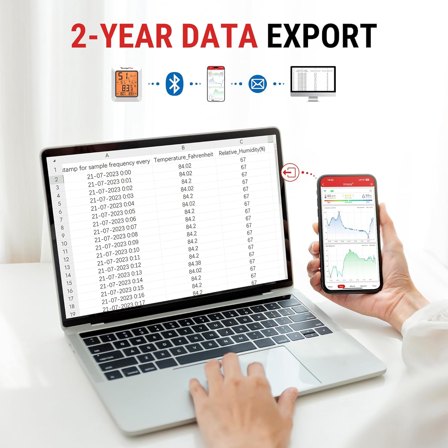 Data Storage & Export: Gain deep insights into your environment over time. This thermometer stores up to two years of data and allows for easy export, helping you analyze trends to adjust humidifiers, dehumidifiers, or HVAC settings proactively.