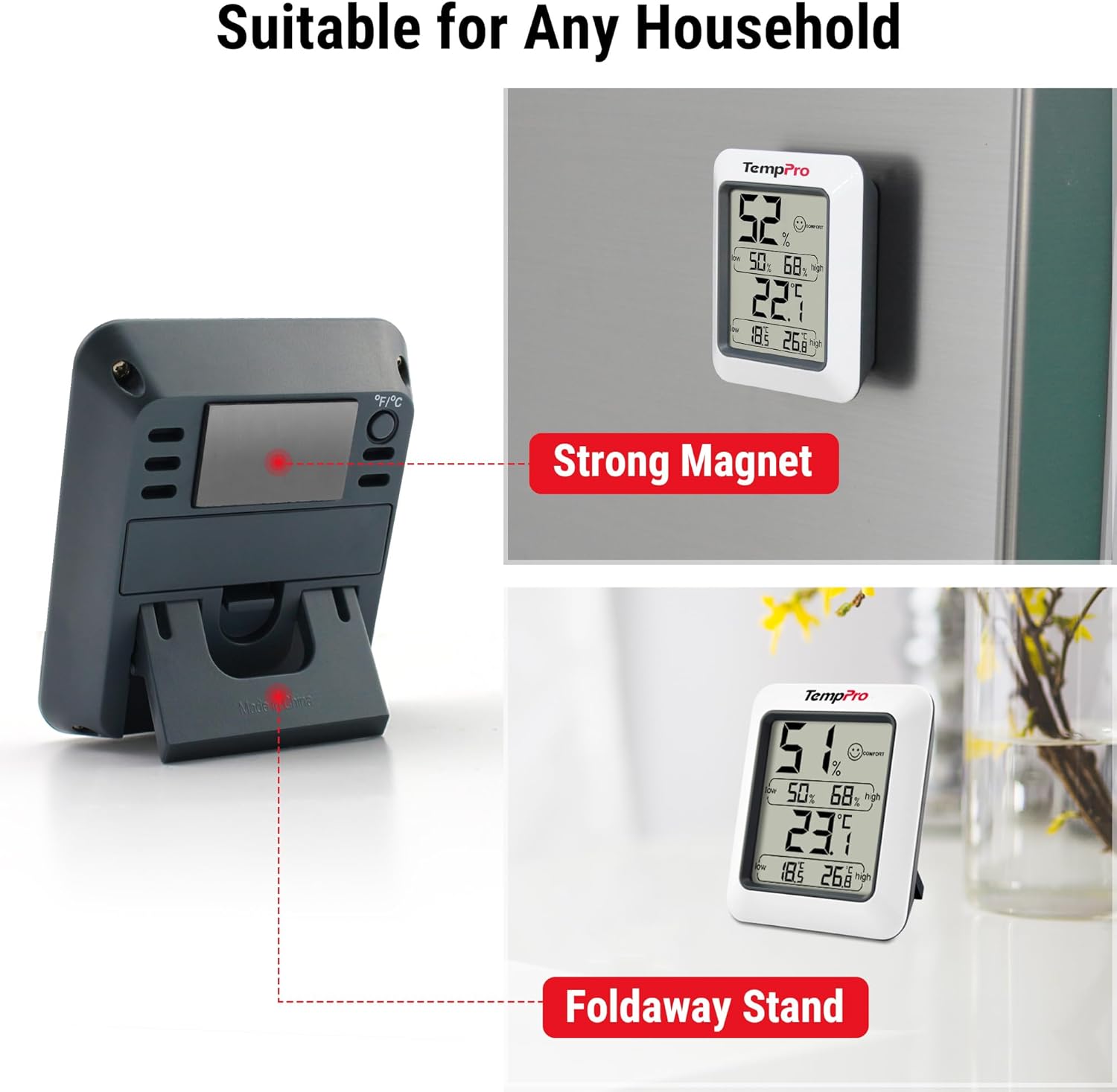 Maintain a comfortable and healthy living environment with the TempPro TP50 Digital Hygrometer and Indoor Thermometer. Designed for precision, this device ensures you are always aware of your home’s air quality. The high-accuracy sensor provides reliable readings with a temperature accuracy of ±1°F and humidity accuracy of ±2–3%RH, making it perfect for monitoring greenhouses, nurseries, or cigar humidors where conditions fluctuate.
