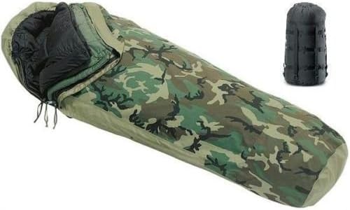 - 4-PIECE MODULAR KIT: Includes Green Patrol Bag, Black Intermediate Cold Weather Bag, Waterproof Woodland Camo Gore-Tex Bivy Cover, and Stuff Sack.