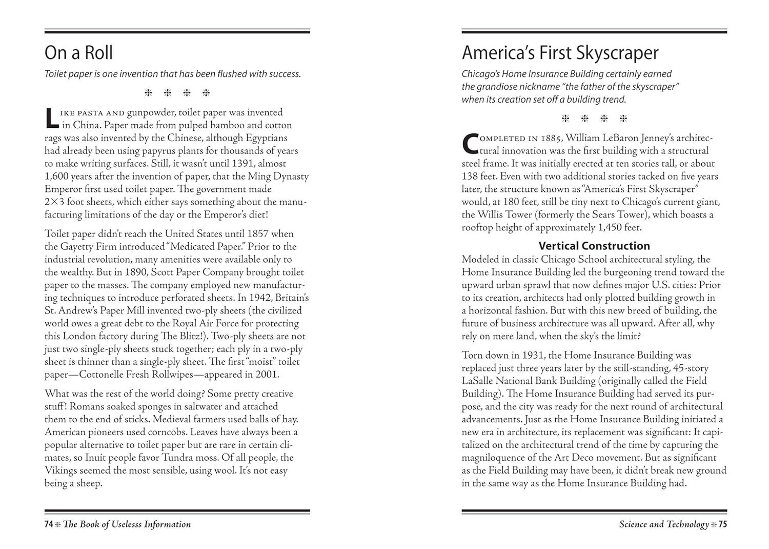 Looking for a gift for Dad, a unique stocking stuffer, or a present for the person who has everything? This heavy-duty padded hardcover makes a wonderful keepsake. Whether you are sitting by the fireplace, waiting at the airport, or just relaxing on the couch, The Book of Useless Information provides hours upon hours of fascinating reading.