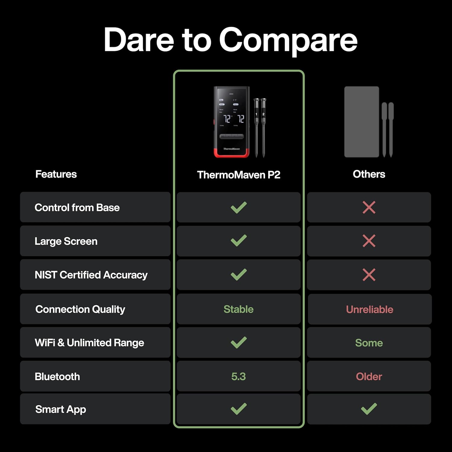 Elevate your culinary skills with the ThermoMaven P2 Smart Meat Thermometer, the ultimate tool for precision cooking. Unlike standard models that rely on a phone screen, the P2 features a Smart Display Base, allowing you to monitor temperatures and set alarms directly on the device. Enjoy total freedom with advanced dual-connectivity: use 2.4GHz Wi-Fi to monitor your cook from anywhere in the world via the app, or utilize Bluetooth for seamless, energy-efficient local control.