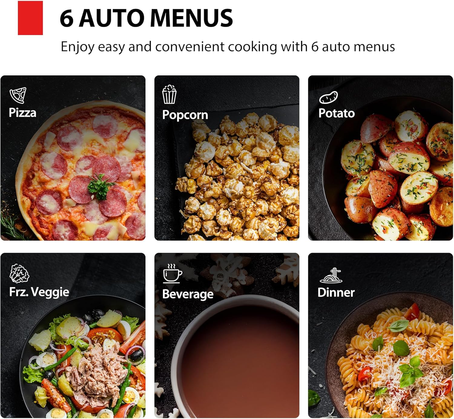 - SMART COOKING: Features 6 Auto Menus for optimized heating of popular foods, including popcorn, pizza, and vegetables.
