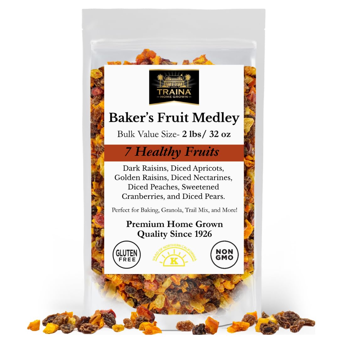 Traina Home Grown Baker’s Dried Fruit Medley – 2 lb Bulk Resealable Pouch of Raisins, Apricots, Peaches, Nectarines, Pears & Cranberries | Non-GMO, Gluten-Free & Vegan Healthy Snack