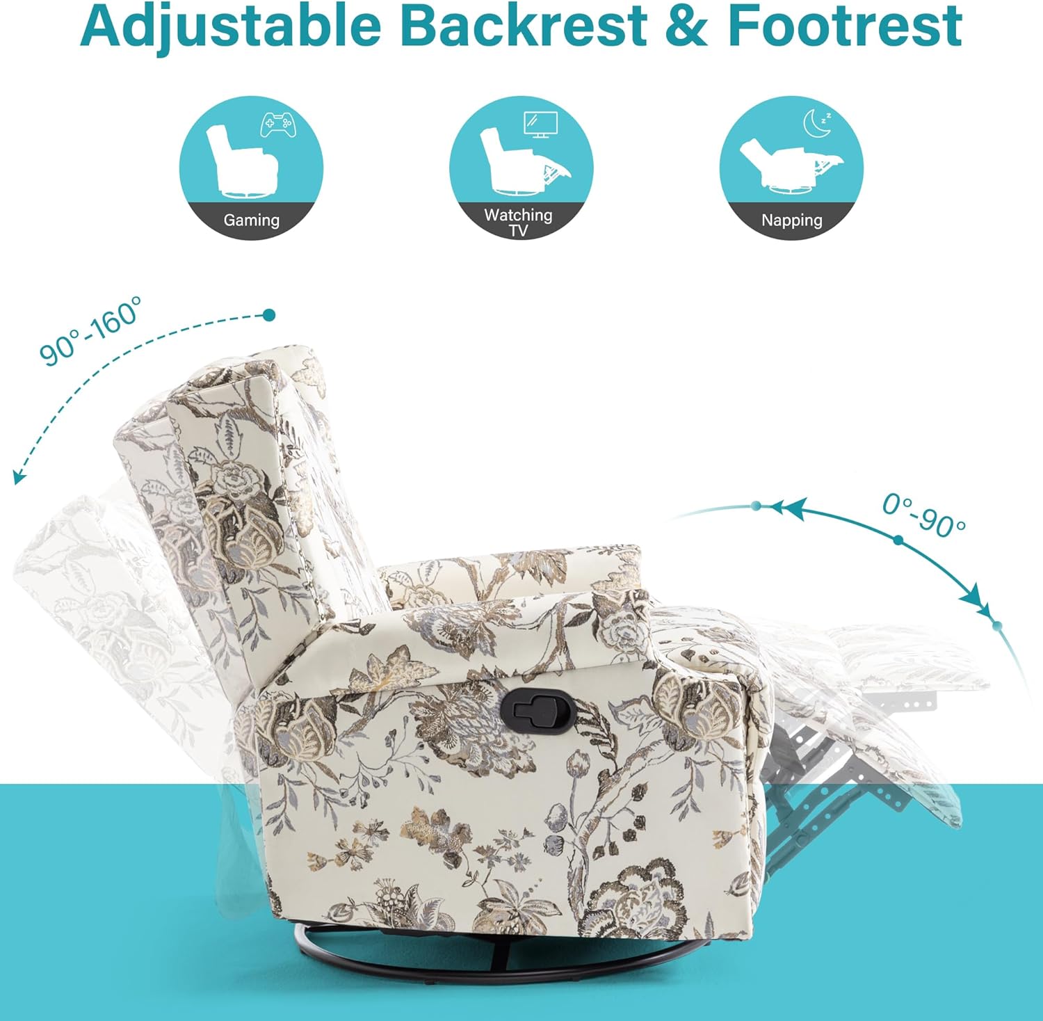• MULTIFUNCTIONAL RELAXATION: Features a 360° swivel base, smooth gliding rocking motion, and a manual reclining mechanism that adjusts from 90° to 150° for customizable comfort.
