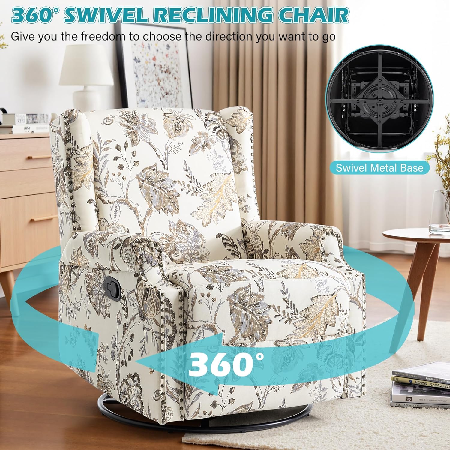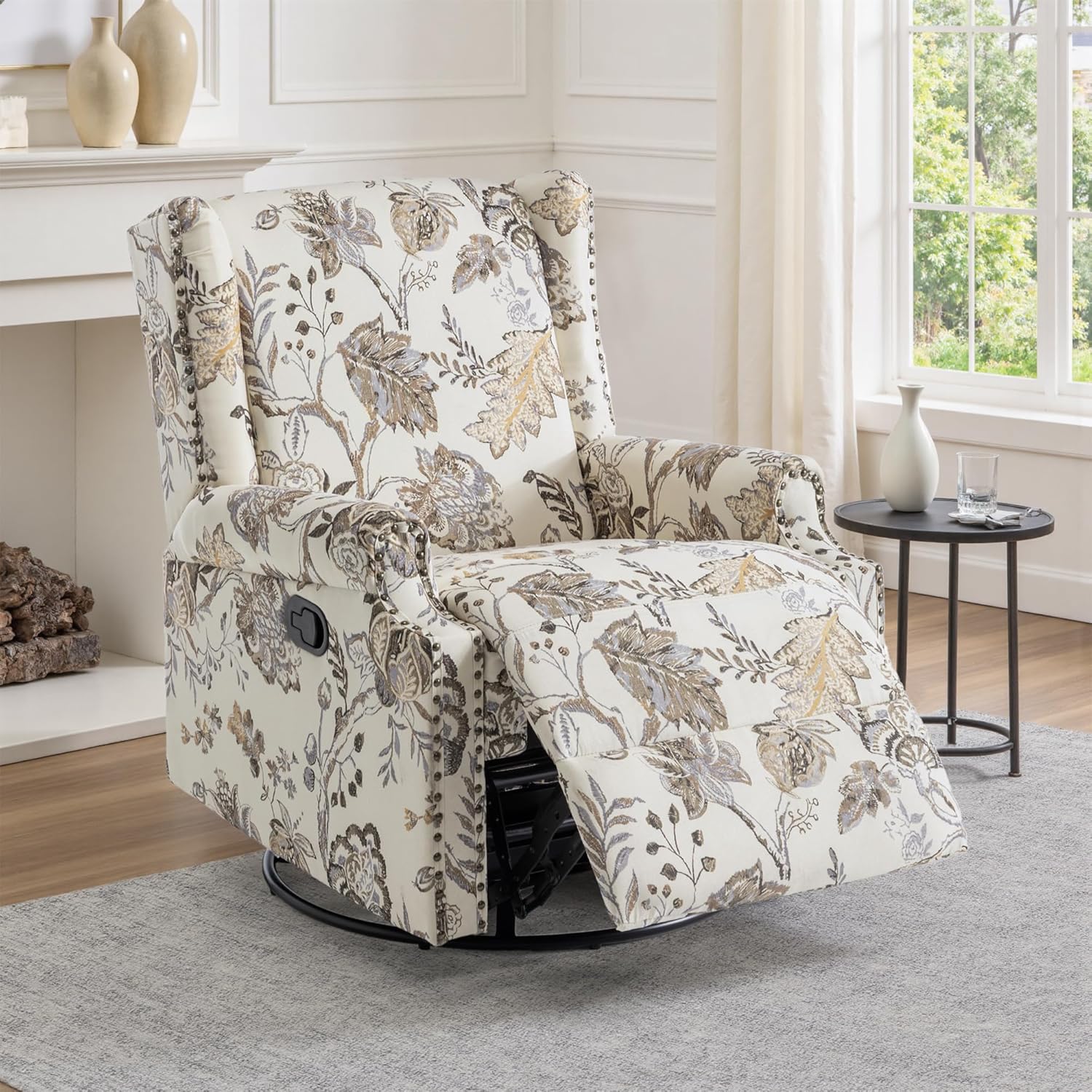 Elevate your relaxation experience with the UIXE Swivel Glider Recliner, a perfect fusion of elegance, comfort, and functionality designed for your living room, nursery, or lounge. Upholstered in a sophisticated beige floral fabric with chic rivet trim, this chair adds a touch of timeless charm to any home decor.