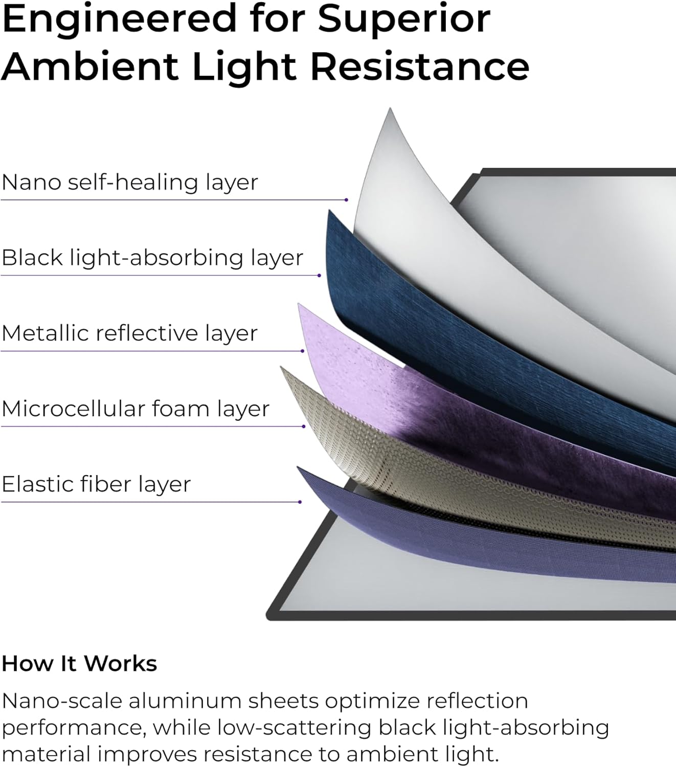 Upgrade your home theater or outdoor movie setup with the ULTIMEA Photon 120. Engineered with cutting-edge E-ALR (Environmental Ambient Light Rejection) technology, this 120-inch screen delivers stunning, vibrant visuals even in well-lit rooms or broad daylight. Say goodbye to washed-out images and enjoy cinema-quality contrast anytime, anywhere.