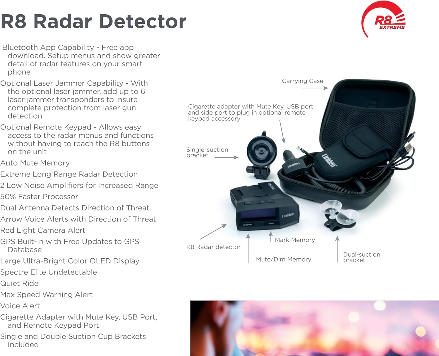 Elevate your driver awareness with the Uniden R8 Extreme Long-Range Radar/Laser Detector. Engineered for maximum performance, the R8 features a cutting-edge dual-antenna system that provides 360-degree protection, identifying threats from all four directions with pinpoint accuracy. The high-contrast display features intuitive directional arrows, voice alerts, and precise signal strength indicators, ensuring you know exactly where and what the threat is.