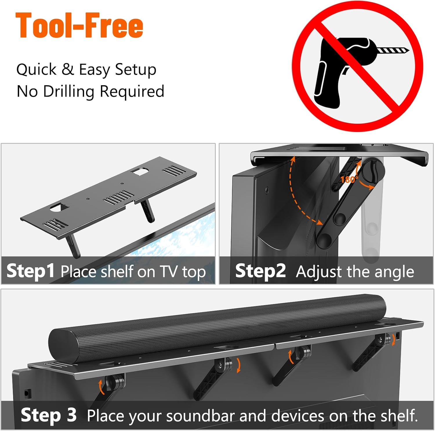 - NO DRILLING REQUIRED: Securely mounts your soundbar on top of your TV in seconds without tools, screws, or wall damage.