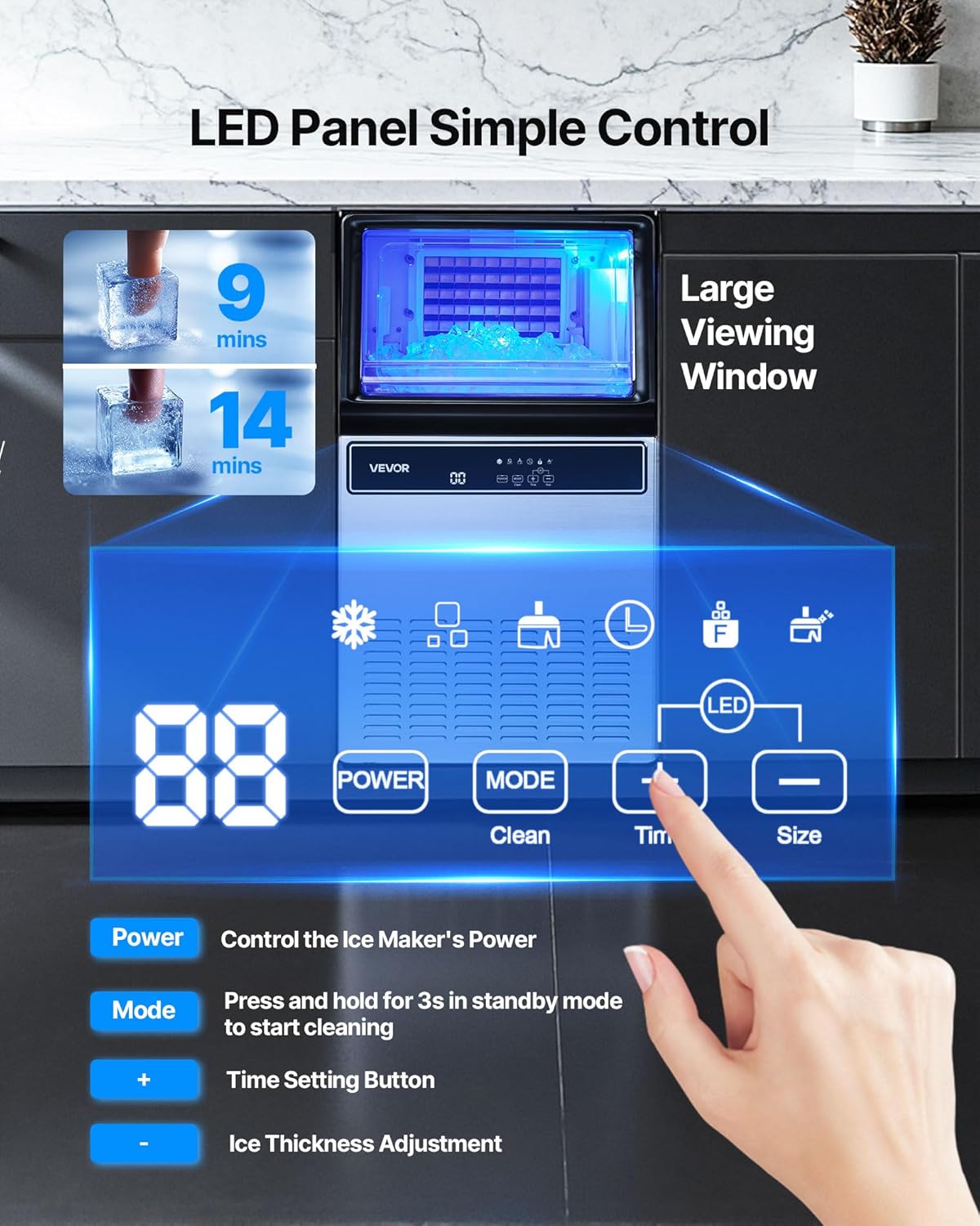 Constructed with heavy-duty stainless steel, this ice machine is built to last while maintaining a sleek, modern aesthetic. Its versatile freestanding design allows it to fit seamlessly under standard counters, making it an ideal choice for kitchens with limited space. The user-friendly LED control panel features a large viewing window and interior blue lighting, allowing you to monitor ice levels at a glance without opening the lid and letting cold air escape.