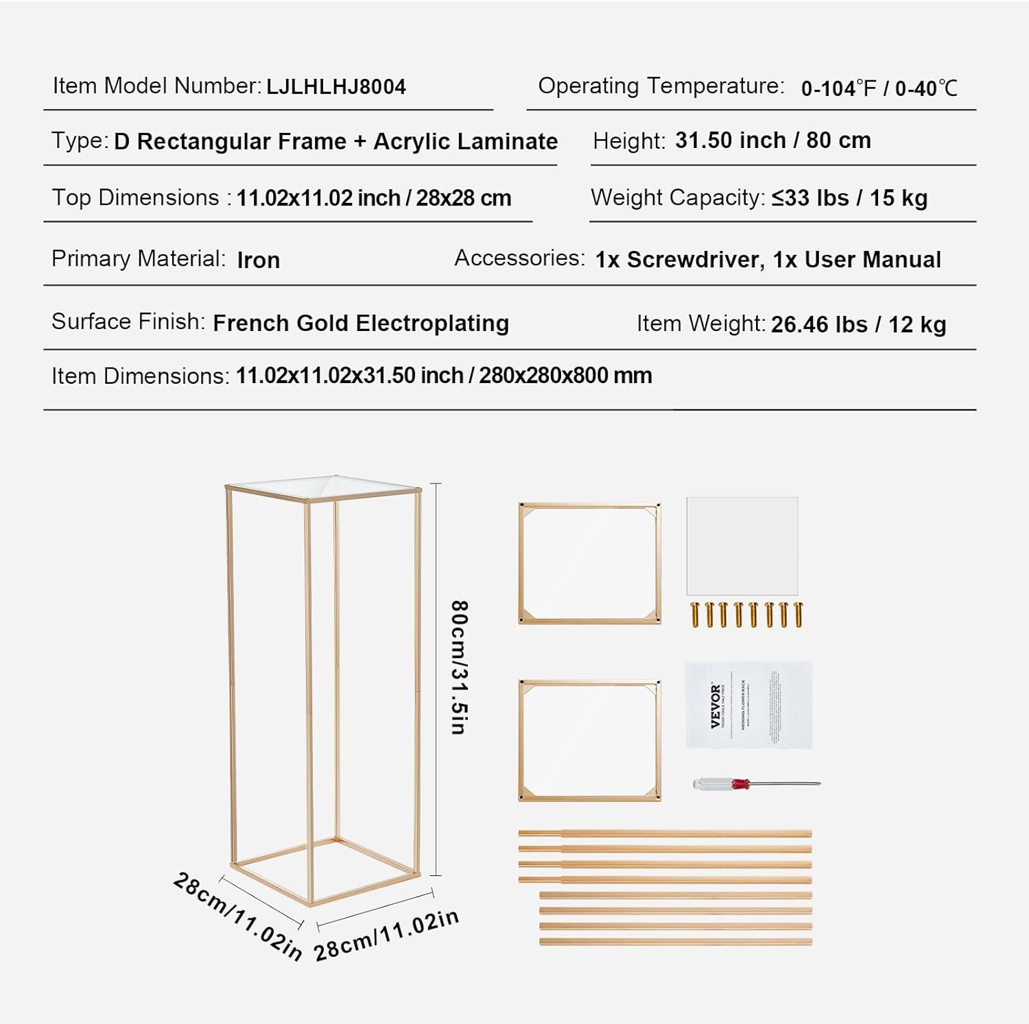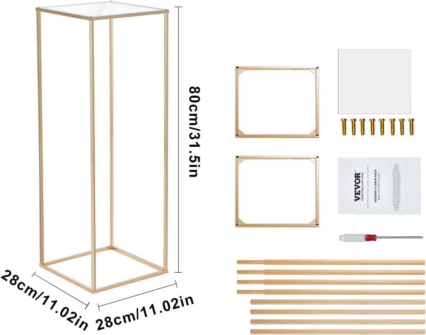 Elevate the ambiance of your special event with the VEVOR 10-Piece Luxury Flower Stand Set. Designed for weddings, engagement parties, and upscale receptions, these stands combine sturdy iron construction with a sophisticated French Gold electroplated finish and premium acrylic laminate tops. The unique D-shaped rectangular frame offers a modern geometric aesthetic that serves as a stunning backdrop for floral arrangements, candles, or decorative accents.
