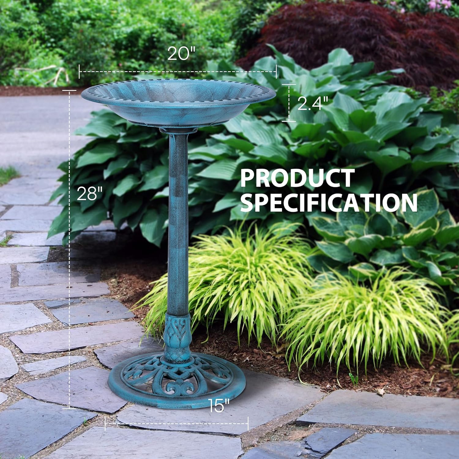 Elevate your outdoor sanctuary with the VIVOHOME 28-Inch Antique Style Bird Bath. Meticulously designed in a graceful European royal style, this bath features a stunning blue patina finish that serves as a captivating focal point for any garden, patio, or lawn. Crafted from durable, high-quality PP material and finished with a resilient resin coating, this bird bath is built to withstand the elements. It resists rain, intense sunlight, and freezing temperatures without denting, cracking, or fracturing. Safety and stability are paramount; the hollow base allows for easy relocation and can be filled with sand or gravel for added weight, while the included three ground stakes ensure the unit remains firmly planted on your lawn. The generous 20-inch diameter bowl provides ample space for multiple wild birds to drink and bathe simultaneously, inviting local wildlife to your space. Assembly is effortless with simple components, allowing you to enjoy this charming garden accent in minutes.