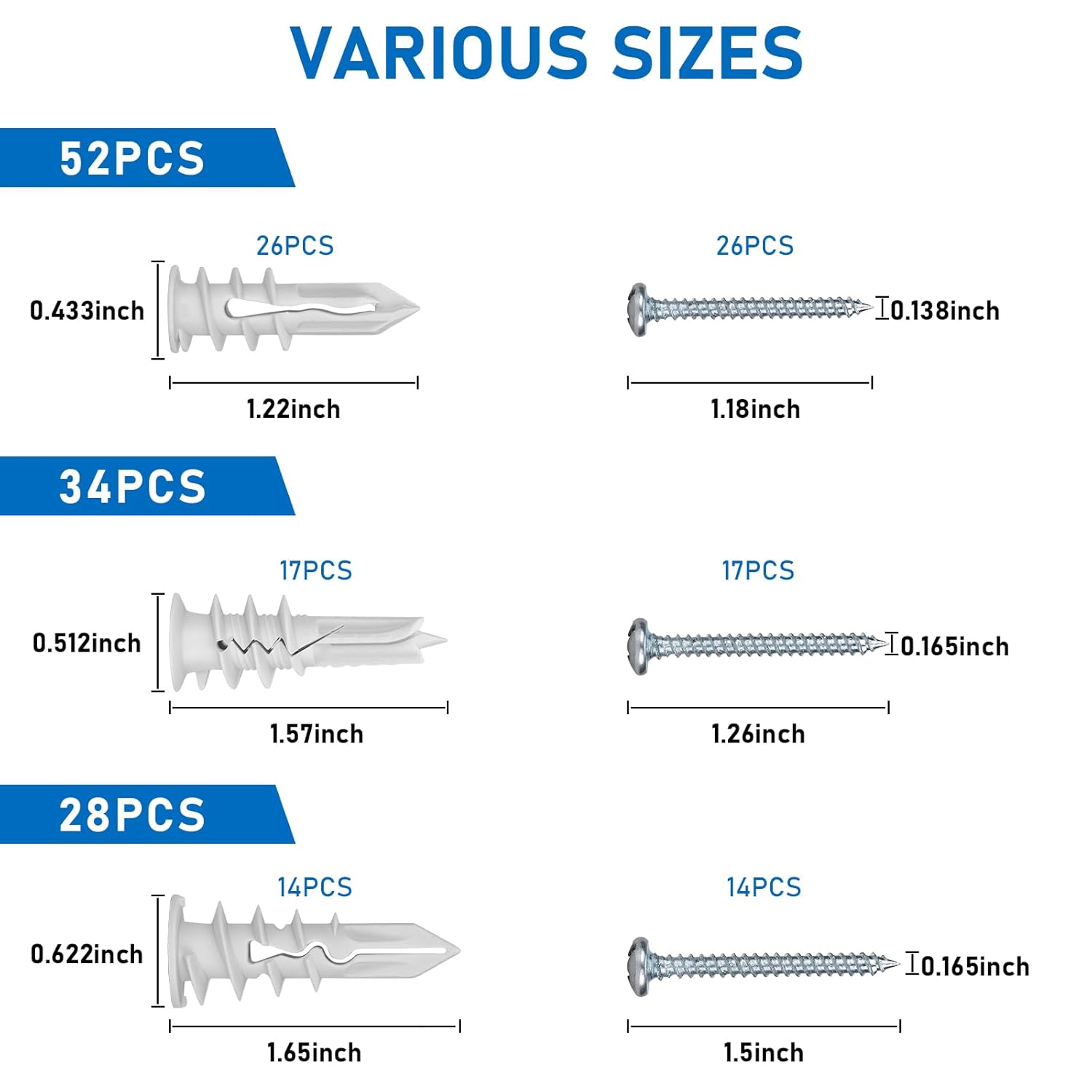 - Triple-Size Versatility: Includes 57 anchors in varying sizes (Large, Medium, Small) paired with 57 corresponding #6 threaded drywall screws. This variety ensures you have the perfect fit for light-duty decor or heavy-duty fixtures.