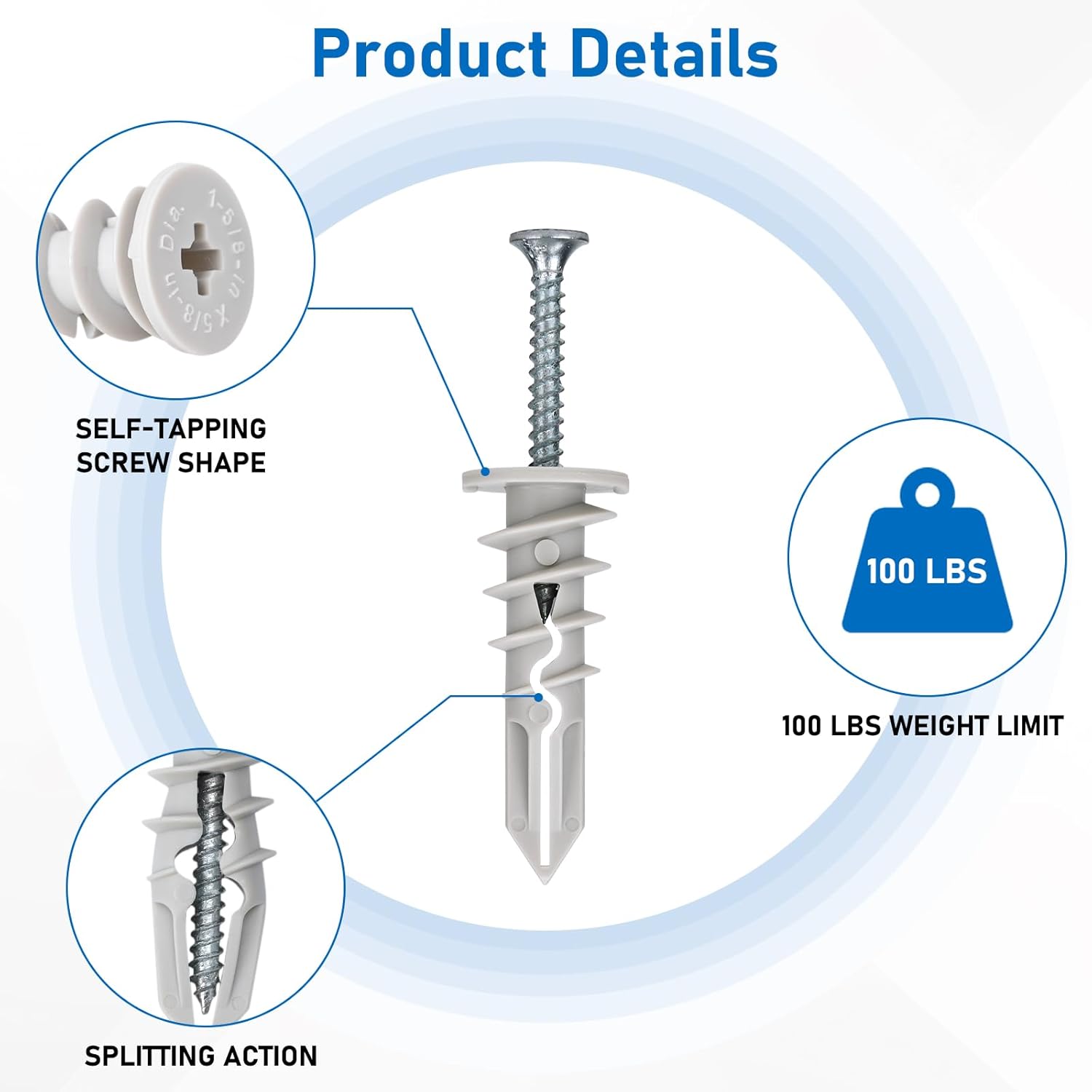 - Effortless Installation: The sharp, self-drilling tip design allows you to skip the pre-drilling step. Simply use a Phillips head screwdriver to tap the anchor into the drywall—no pilot hole required.