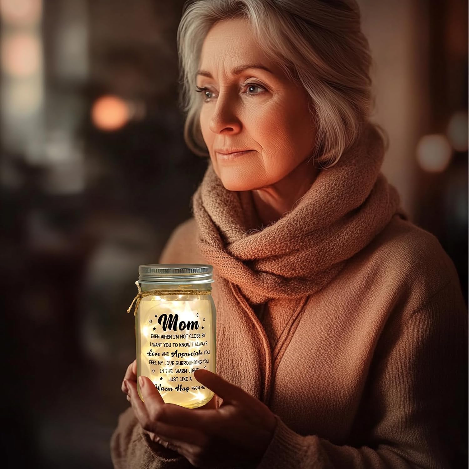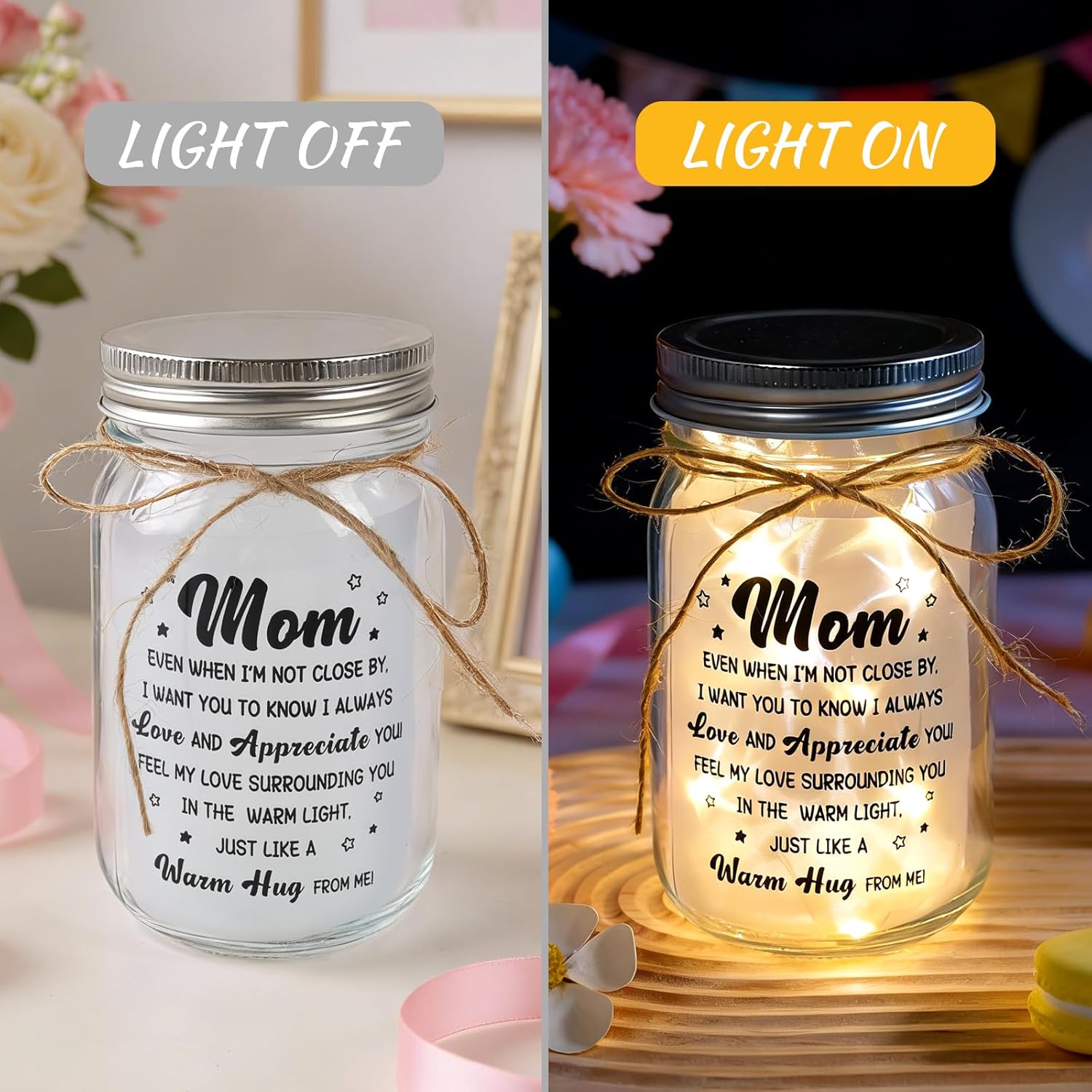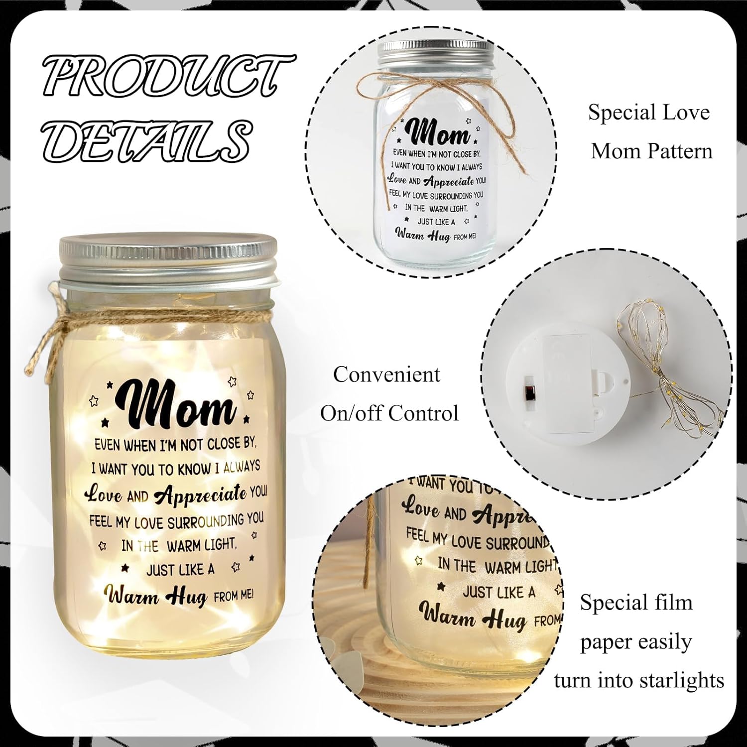 - HEARTFELT ‘WARM HUG’ DESIGN: A sentimental gift for Mom from daughter or son, symbolizing love and gratitude with a cozy, glowing mason jar aesthetic.