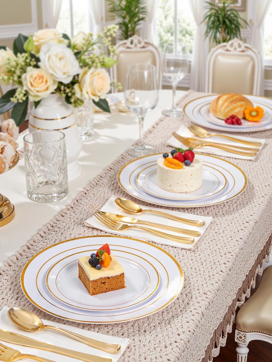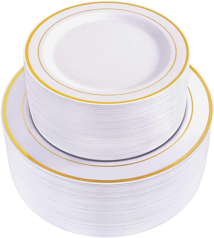 Spend more time celebrating and less time washing dishes. These plates offer the best of both worlds: the aesthetic appeal of reusable gold-rimmed china with the convenience of disposable tableware. Simply recycle or dispose of them after the party. They are suitable for a wide array of events, including Spring flings, Baby Showers, Birthdays, Thanksgiving, Christmas, Hanukkah, and upscale catered events.