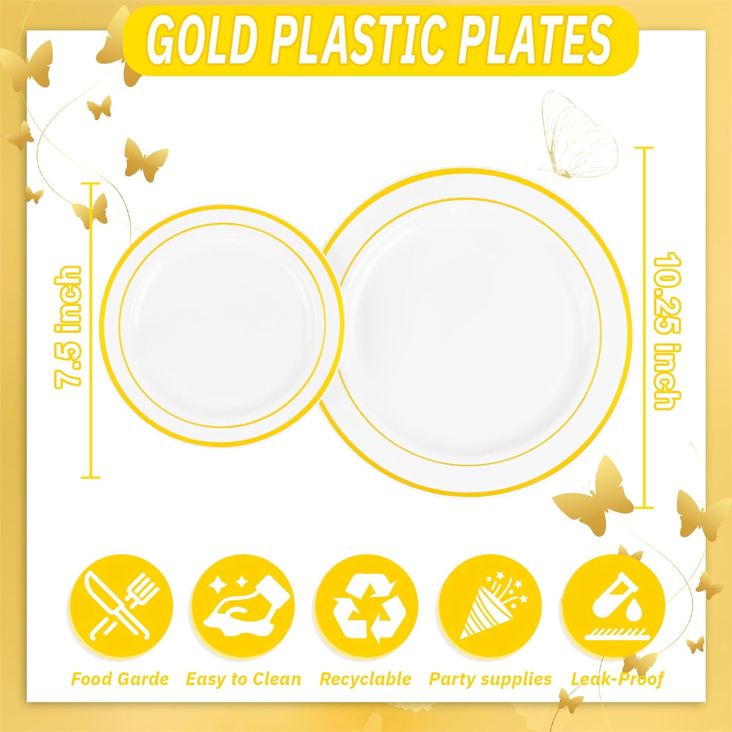 Forget flimsy dinnerware that bends under the weight of food. Crafted from heavy-duty, high-grade plastic, these plates are sturdy enough to handle a full meal while remaining completely disposable. The premium construction ensures they won’t scratch easily, allowing your guests to enjoy their meal in comfort. The gold rim is professionally applied to provide a lustrous finish that sparkles under the light, adding a touch of class to any occasion.